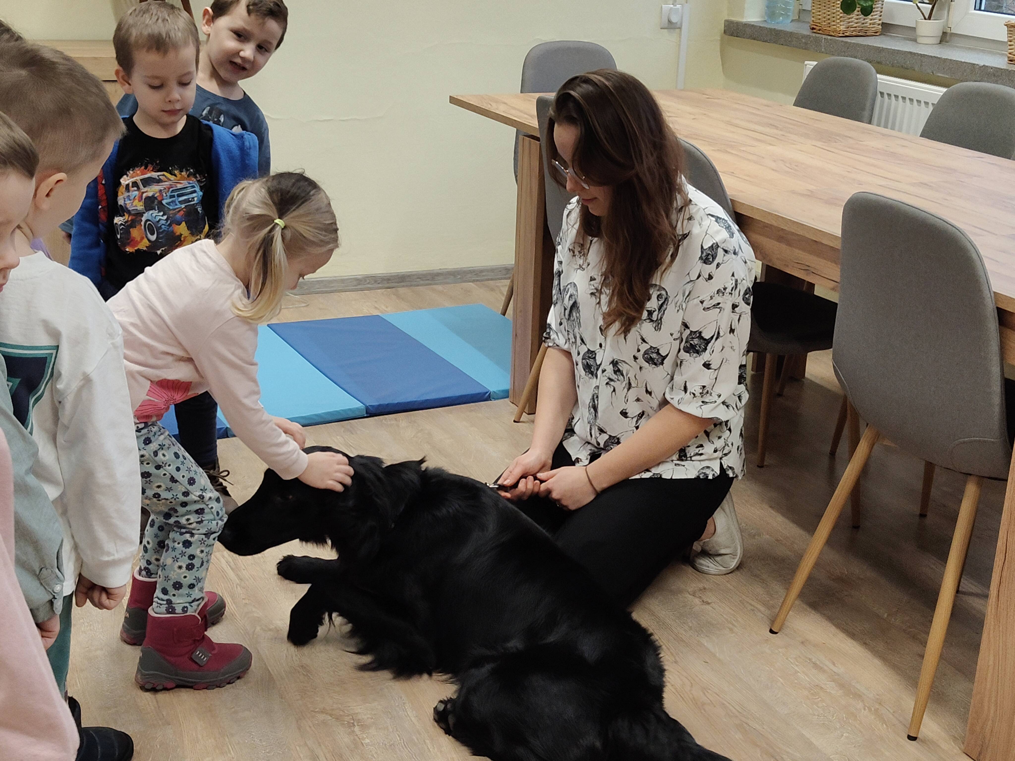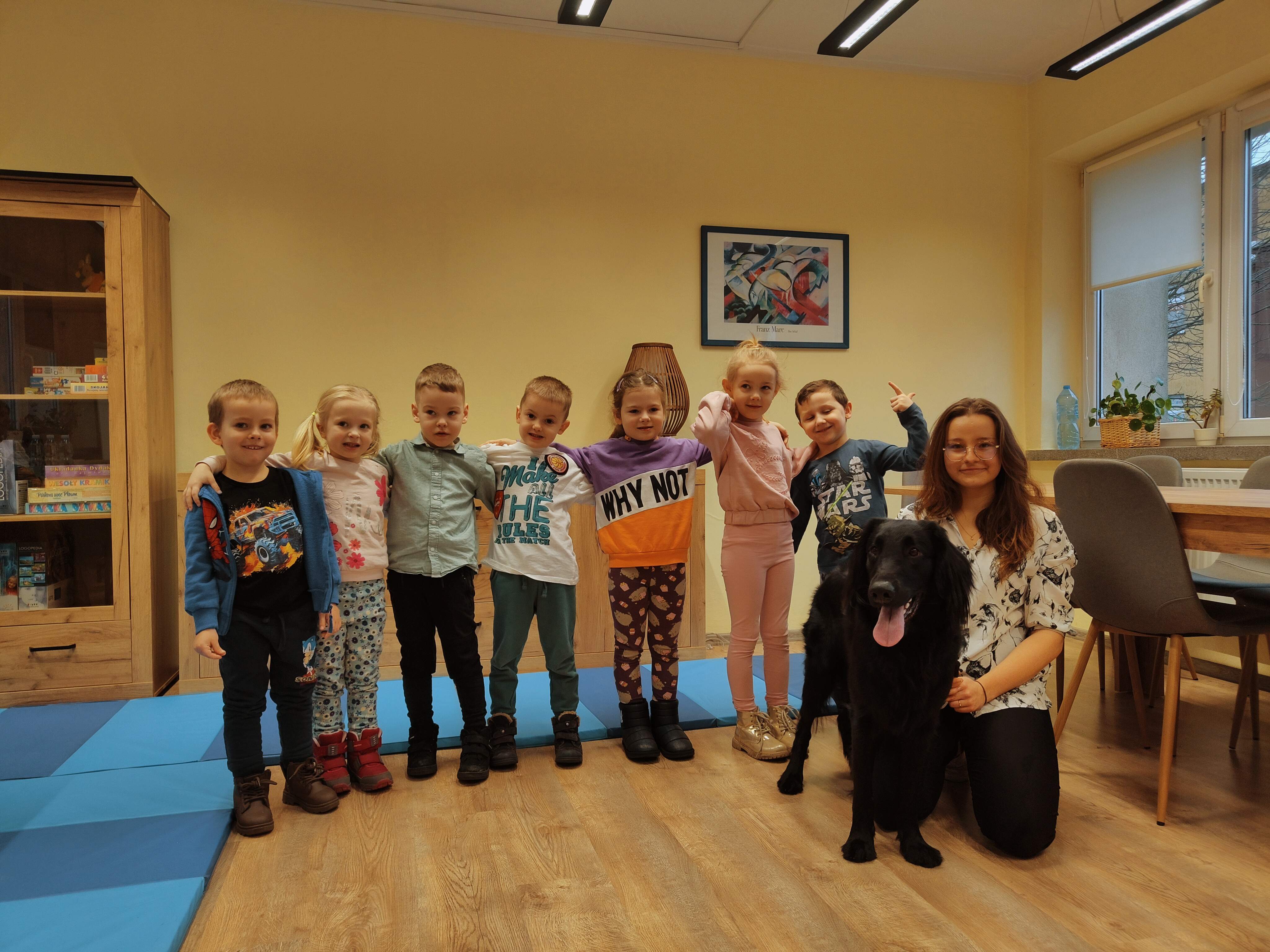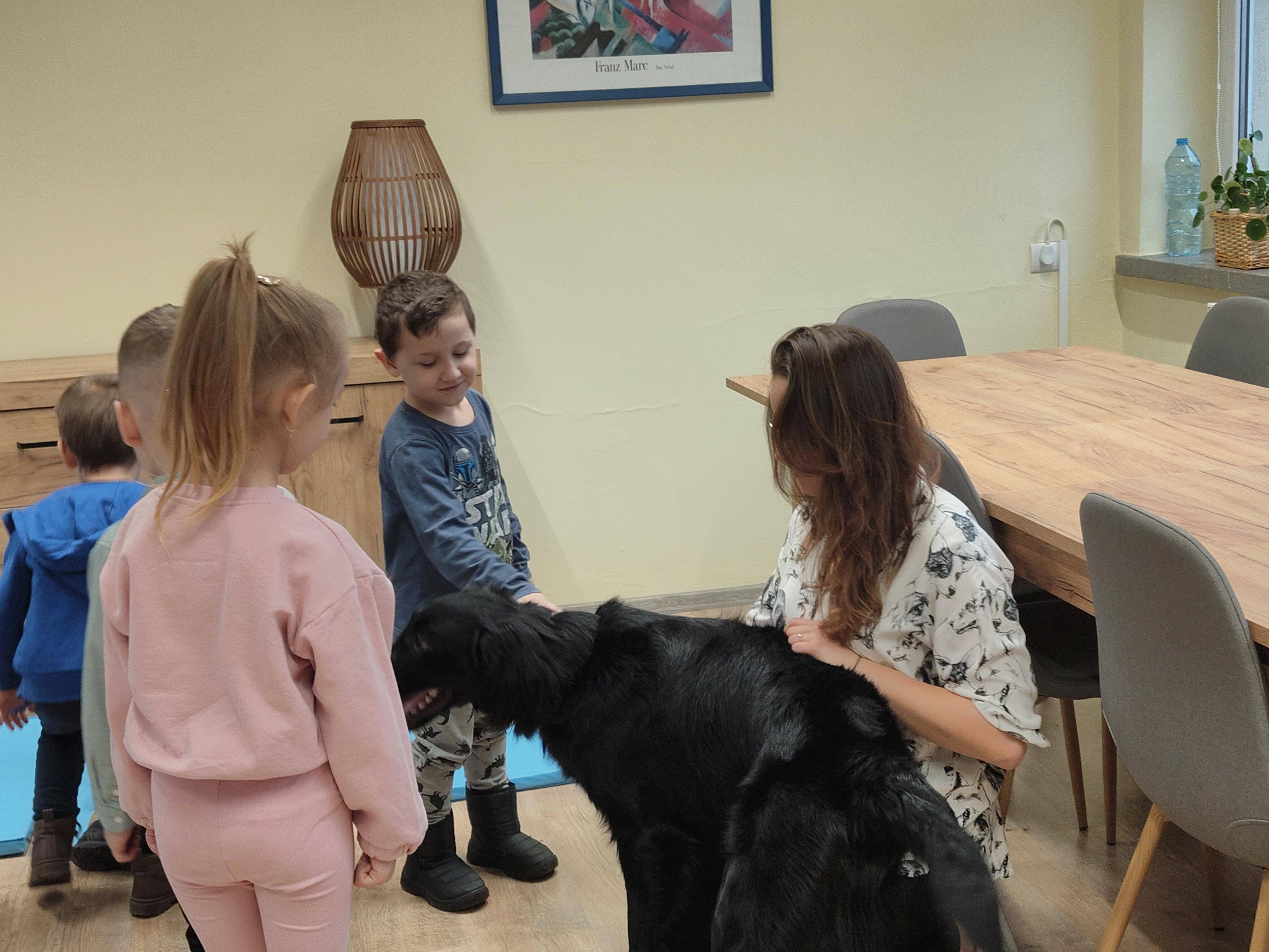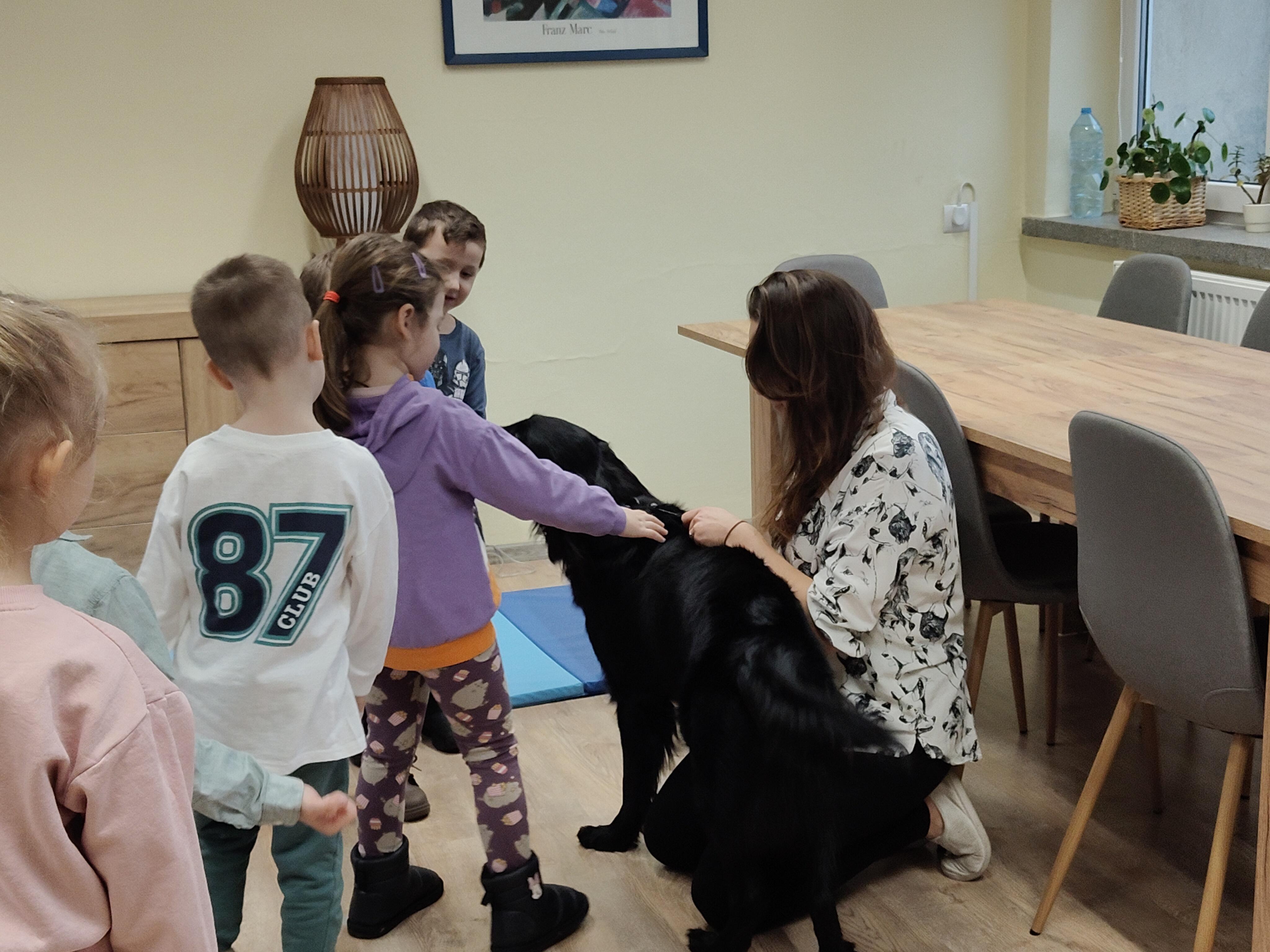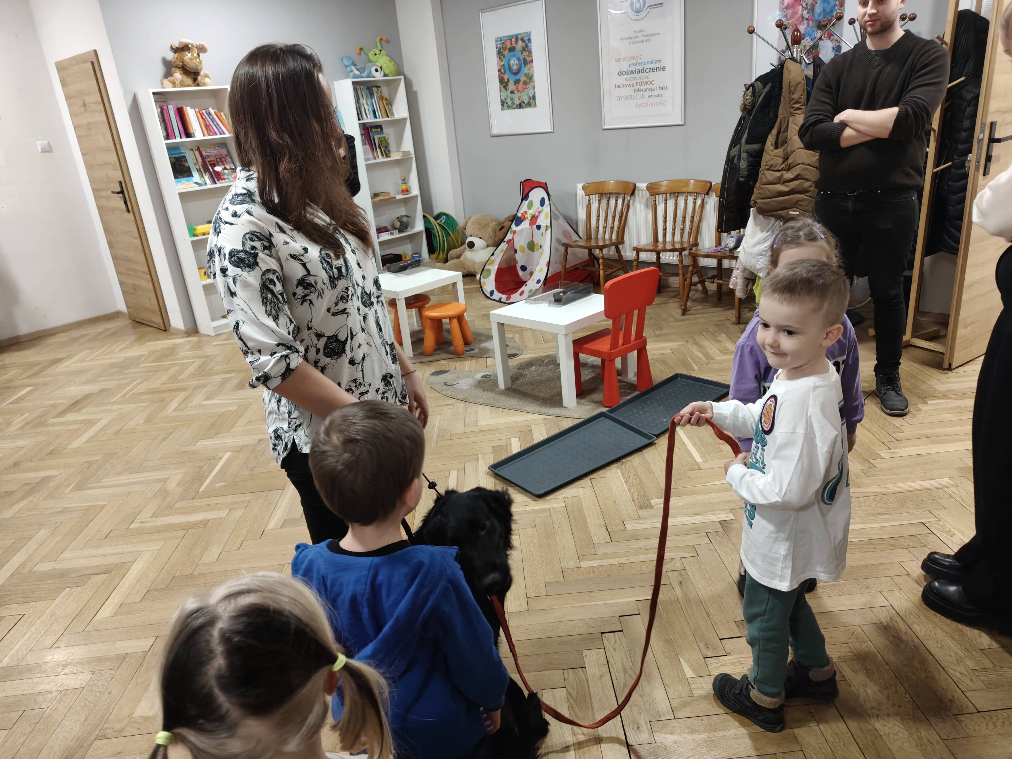 Dziś odwiedziliśmy Poradnię Psychologiczno-Pedagogiczną, gdzie mieliśmy okazję uczestniczyć w wyjątkowych zajęciach z dogoterapii. Podczas spotkania mogliśmy poznać wspaniałe pieski – głaskać je, karmić, bawić się z nimi oraz wybrać się na krótki spacer. Pani prowadząca opowiedziała nam o pracy psa terapeuty oraz zaprezentowała, jakie sztuczki potrafi wykonać pies – byliśmy pod ogromnym wrażeniem! Atmosfera była niezwykle ciepła i przyjazna. Panie w poradni przyjęły nas z uśmiechem i ogromną życzliwością, za co serdecznie dziękujemy. Na zakończenie, po długim spacerze, czekał na nas słodki poczęstunek od Helenki – to był bardzo miły akcent na koniec tak udanego dnia. To było bardzo wartościowe i pełne radości spotkanie. Dziękujemy za zaproszenie!