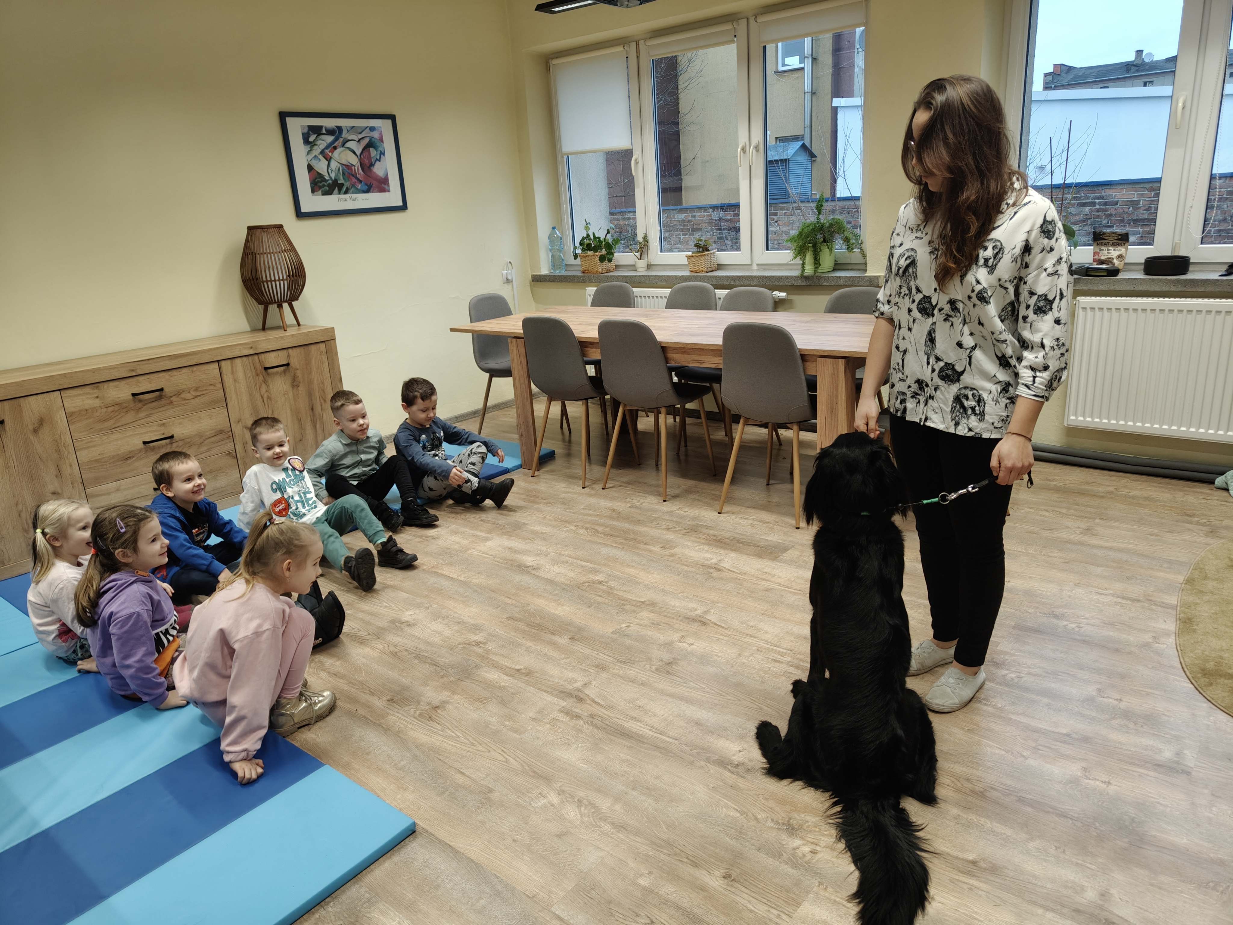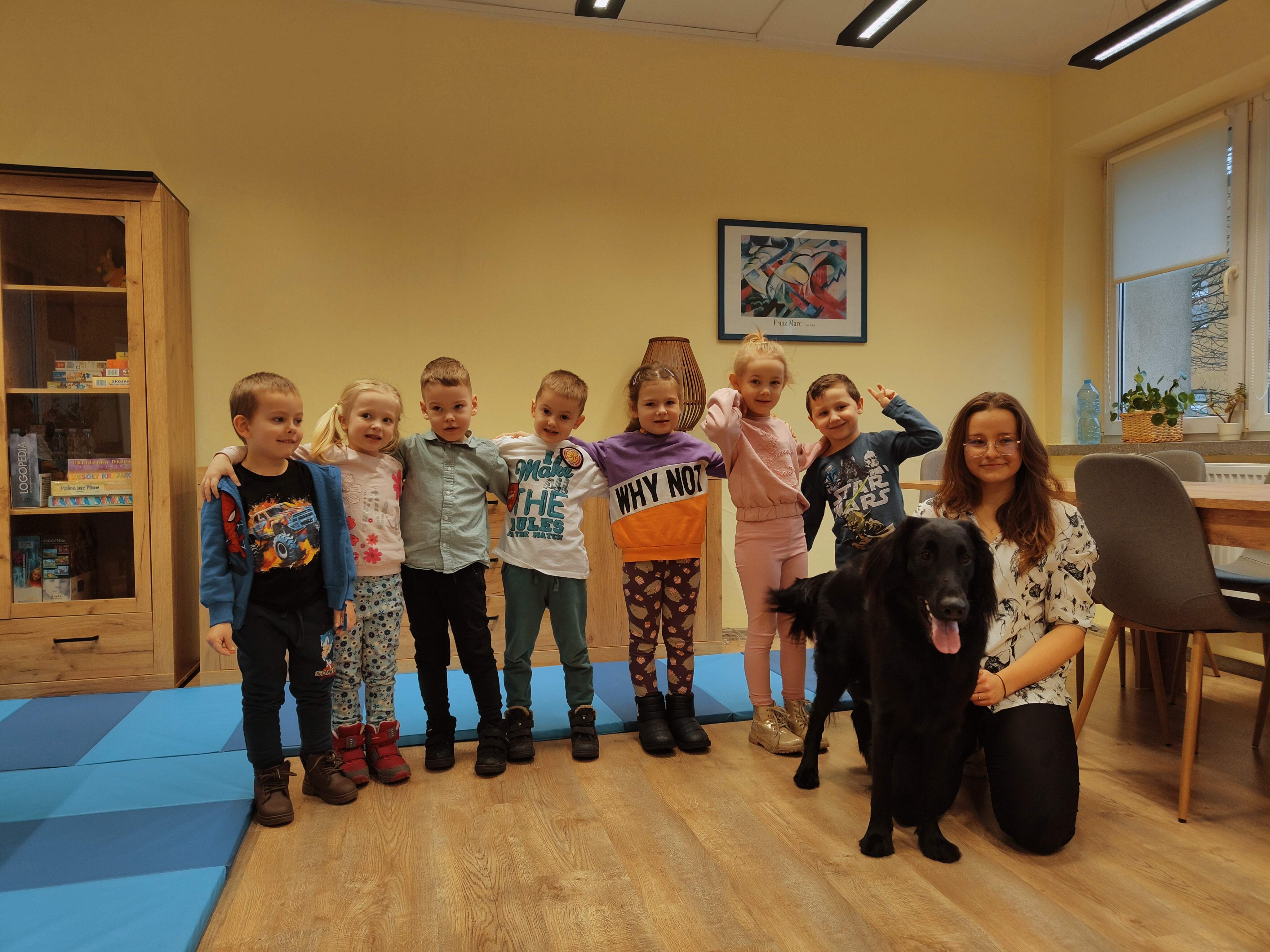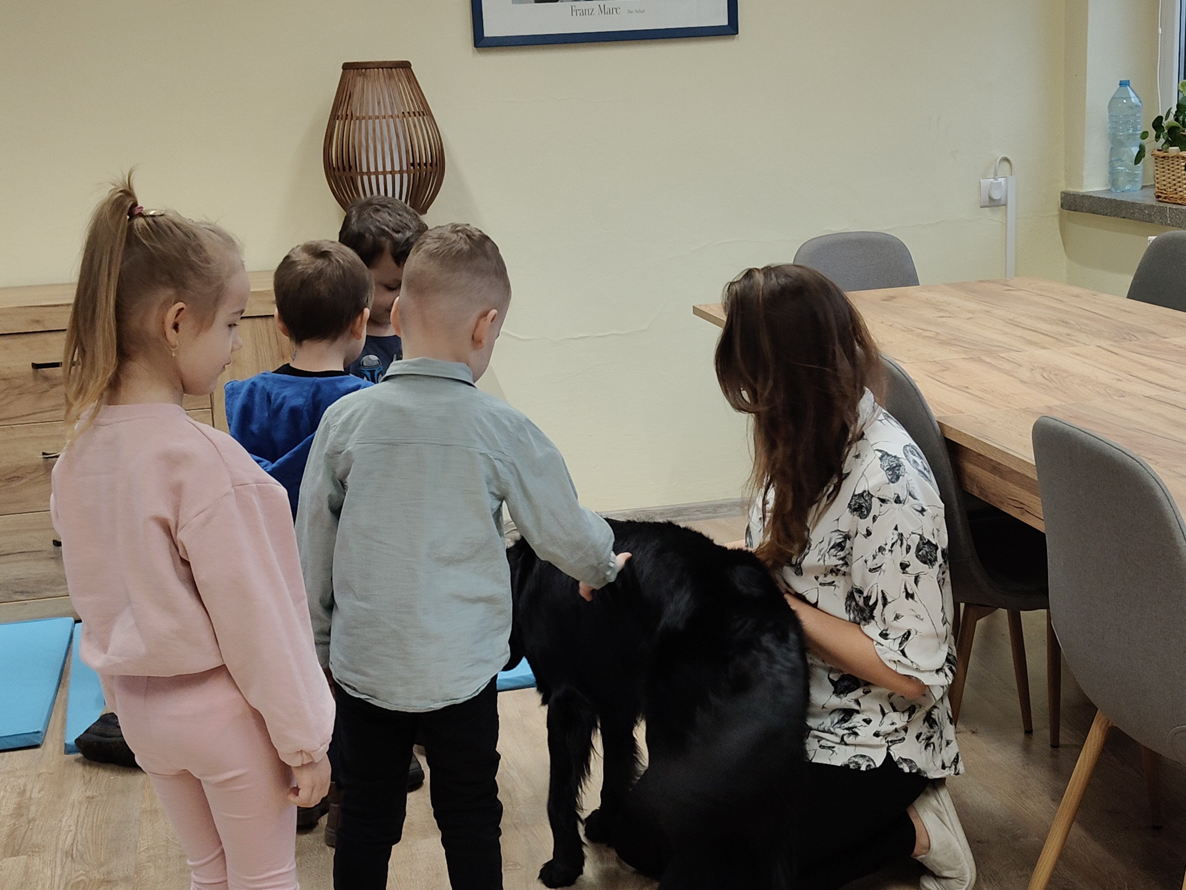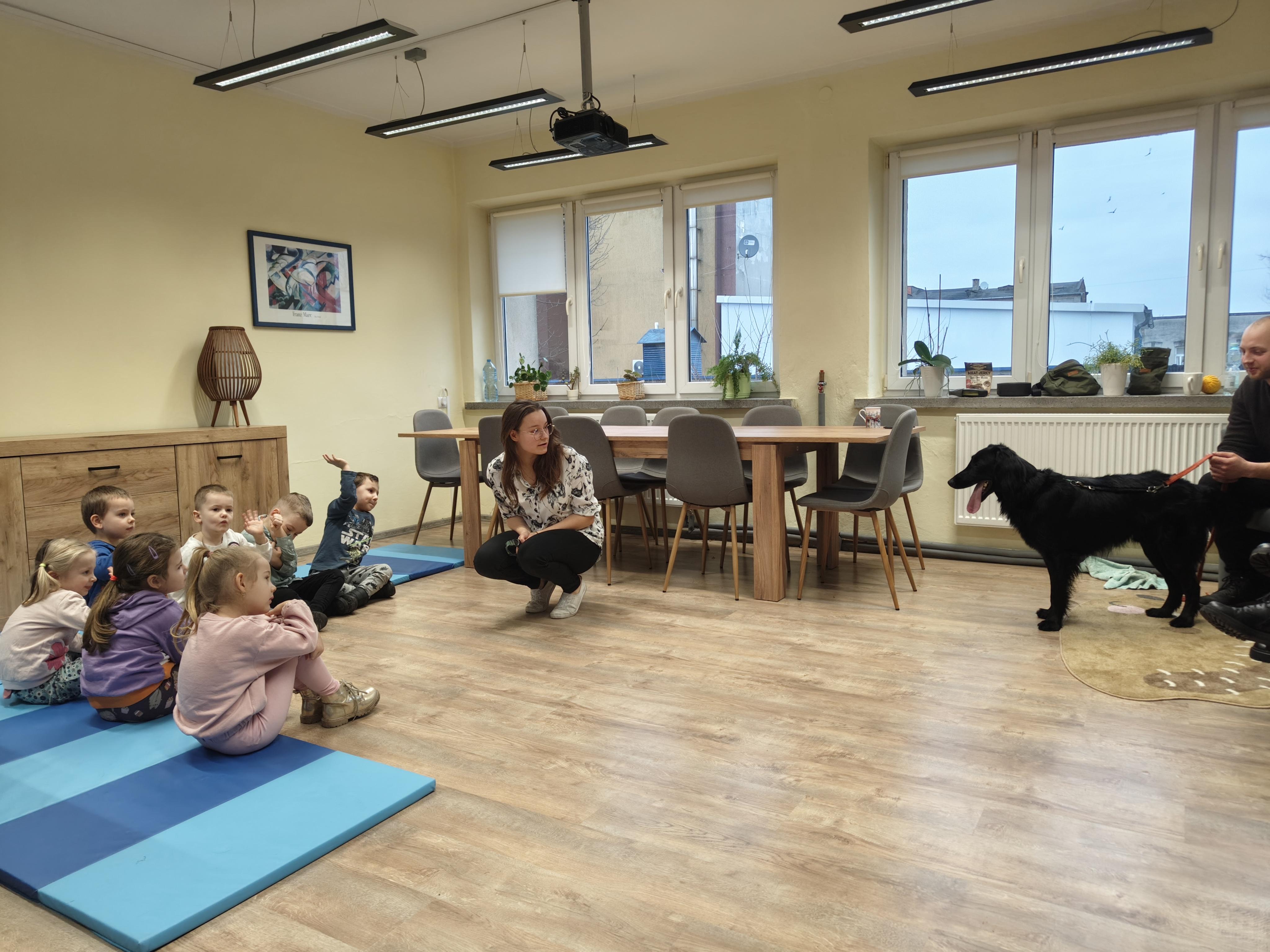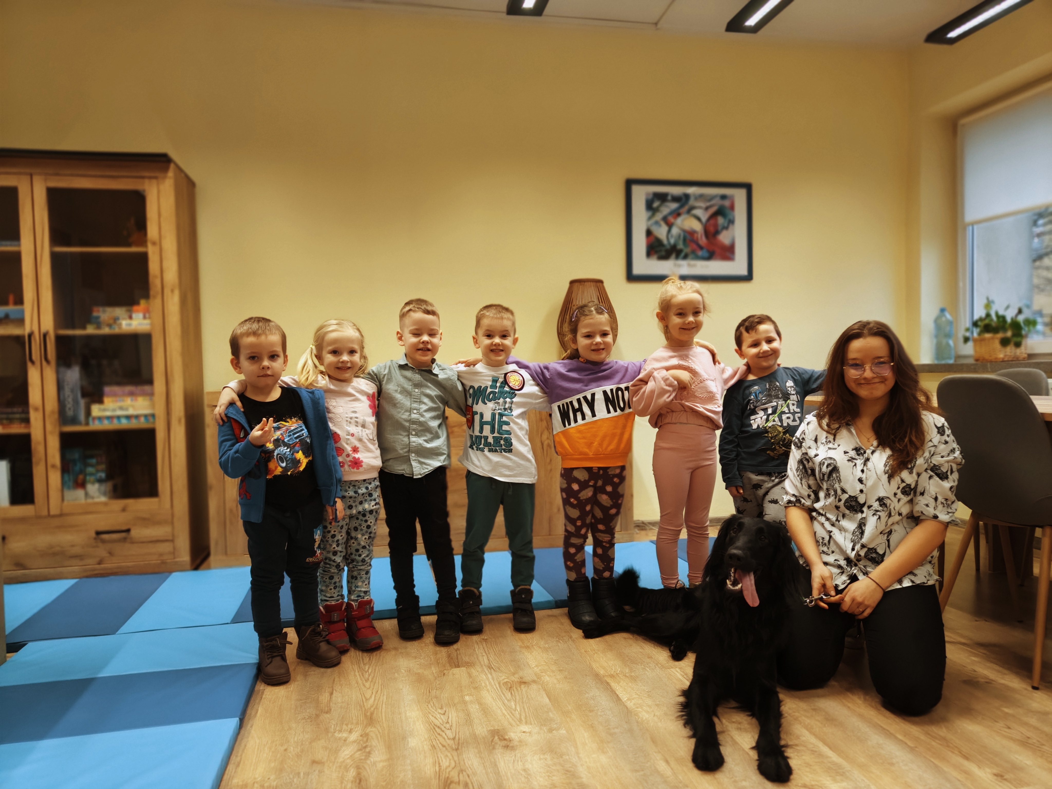 Dziś odwiedziliśmy Poradnię Psychologiczno-Pedagogiczną, gdzie mieliśmy okazję uczestniczyć w wyjątkowych zajęciach z dogoterapii. Podczas spotkania mogliśmy poznać wspaniałe pieski – głaskać je, karmić, bawić się z nimi oraz wybrać się na krótki spacer. Pani prowadząca opowiedziała nam o pracy psa terapeuty oraz zaprezentowała, jakie sztuczki potrafi wykonać pies – byliśmy pod ogromnym wrażeniem! Atmosfera była niezwykle ciepła i przyjazna. Panie w poradni przyjęły nas z uśmiechem i ogromną życzliwością, za co serdecznie dziękujemy. Na zakończenie, po długim spacerze, czekał na nas słodki poczęstunek od Helenki – to był bardzo miły akcent na koniec tak udanego dnia. To było bardzo wartościowe i pełne radości spotkanie. Dziękujemy za zaproszenie!