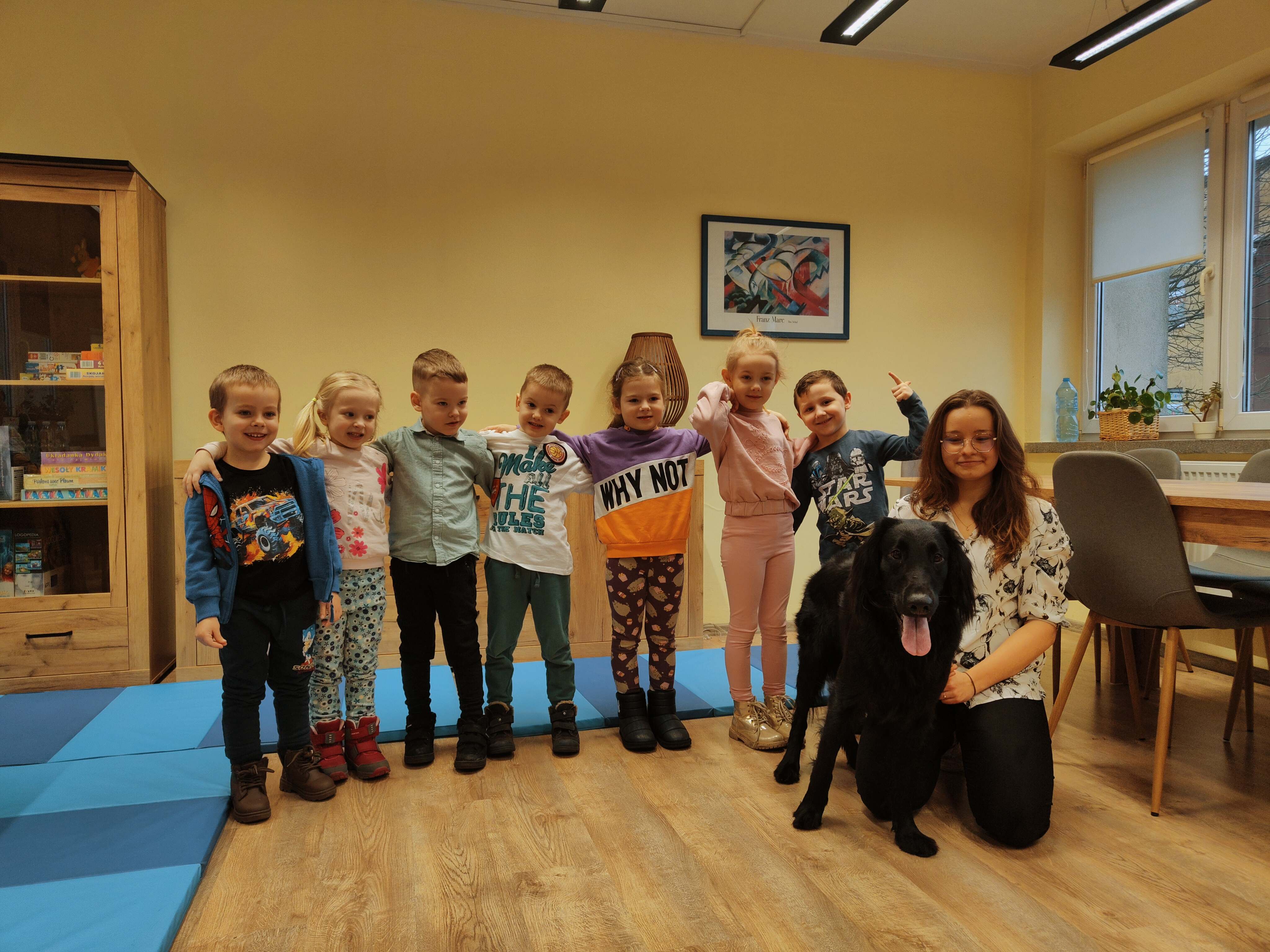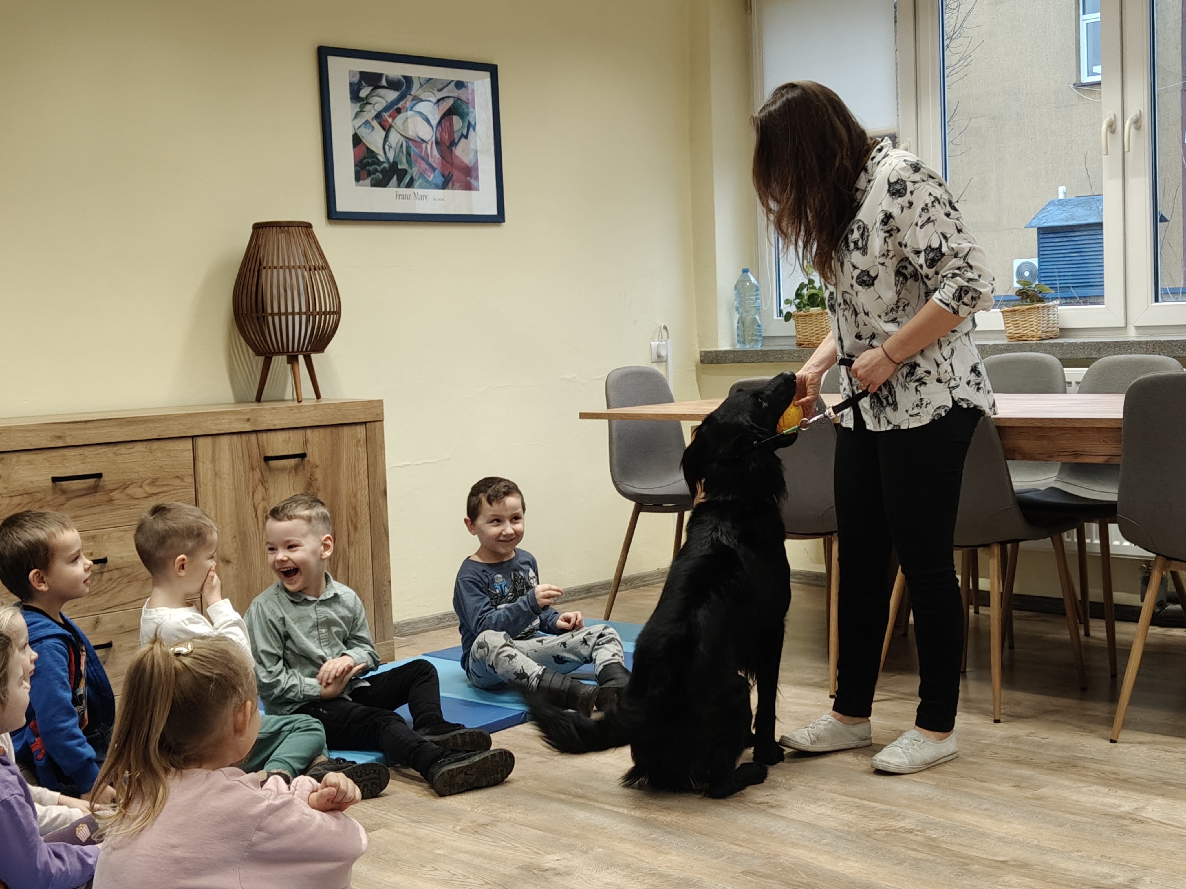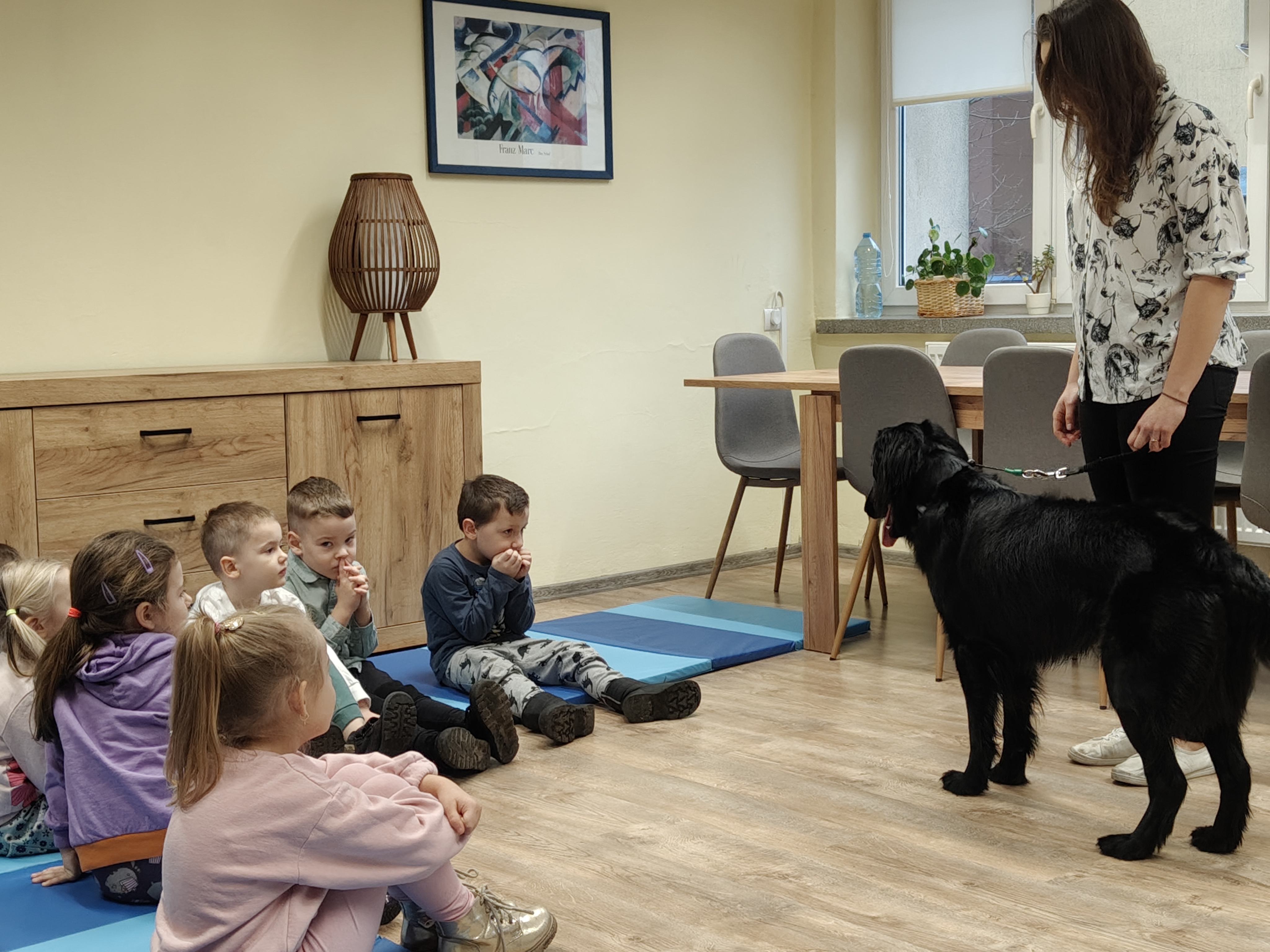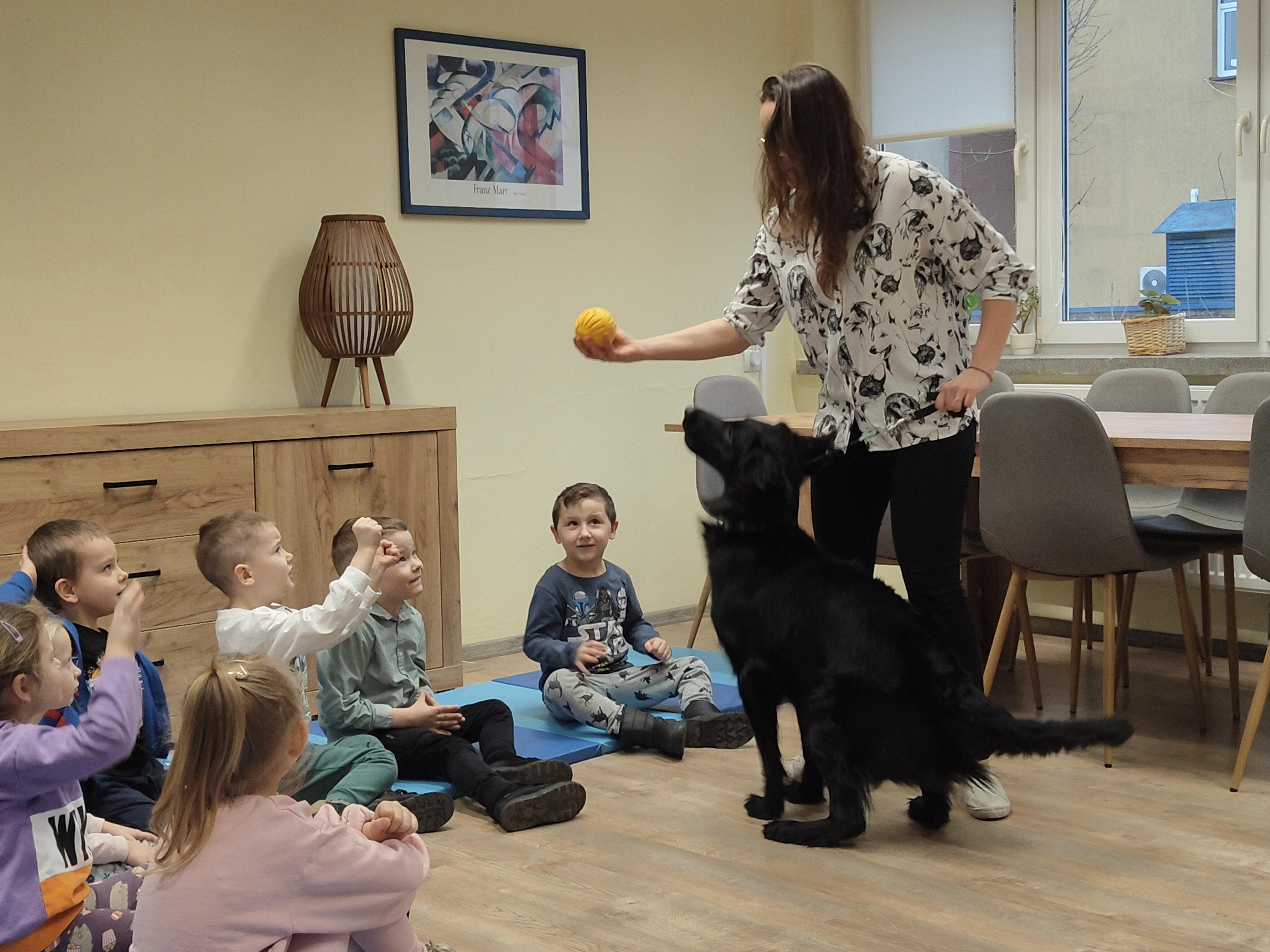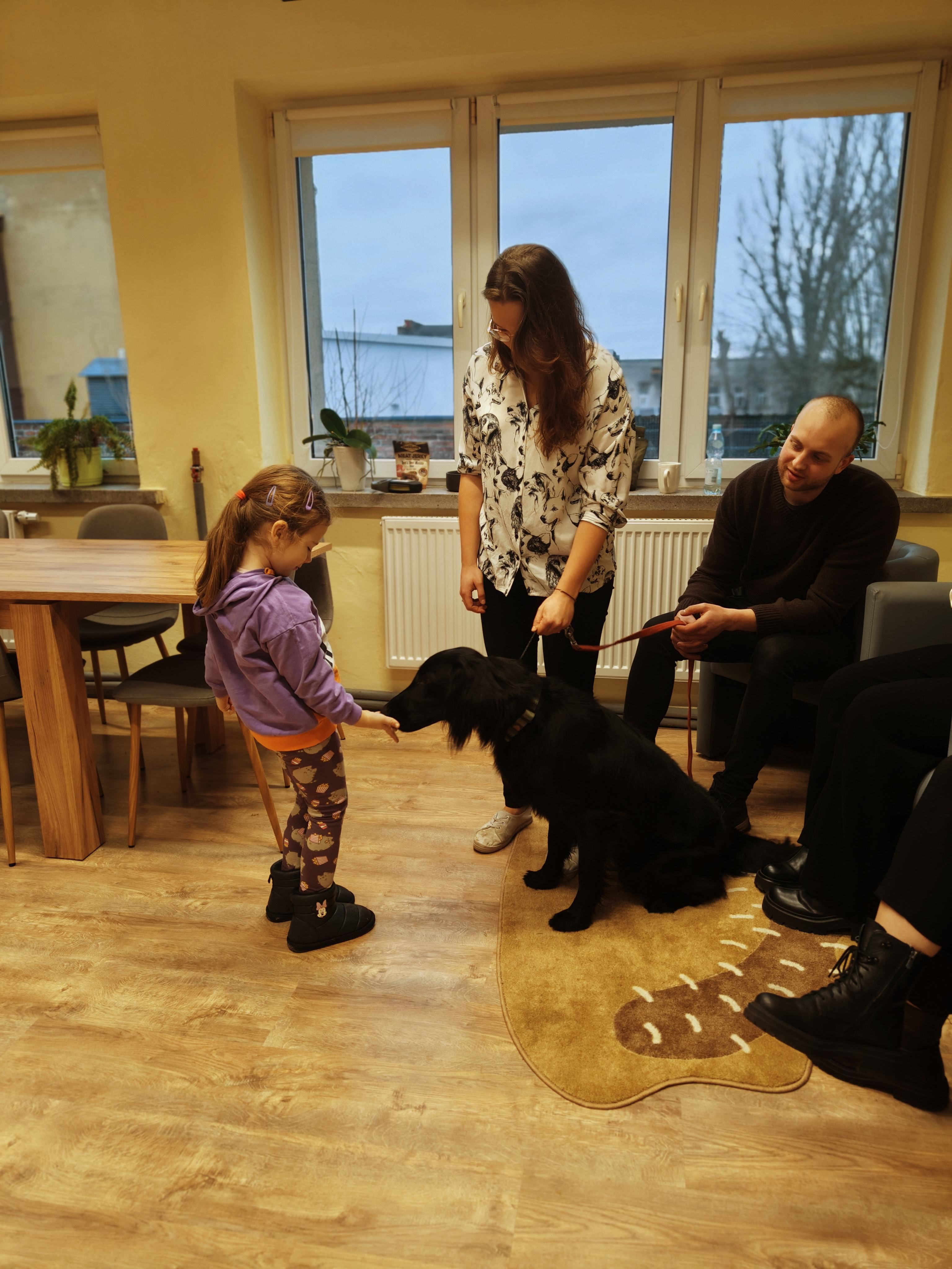 Dziś odwiedziliśmy Poradnię Psychologiczno-Pedagogiczną, gdzie mieliśmy okazję uczestniczyć w wyjątkowych zajęciach z dogoterapii. Podczas spotkania mogliśmy poznać wspaniałe pieski – głaskać je, karmić, bawić się z nimi oraz wybrać się na krótki spacer. Pani prowadząca opowiedziała nam o pracy psa terapeuty oraz zaprezentowała, jakie sztuczki potrafi wykonać pies – byliśmy pod ogromnym wrażeniem! Atmosfera była niezwykle ciepła i przyjazna. Panie w poradni przyjęły nas z uśmiechem i ogromną życzliwością, za co serdecznie dziękujemy. Na zakończenie, po długim spacerze, czekał na nas słodki poczęstunek od Helenki – to był bardzo miły akcent na koniec tak udanego dnia. To było bardzo wartościowe i pełne radości spotkanie. Dziękujemy za zaproszenie!
