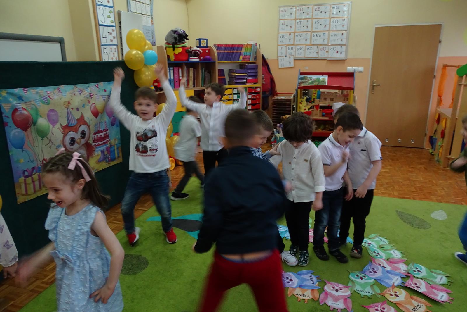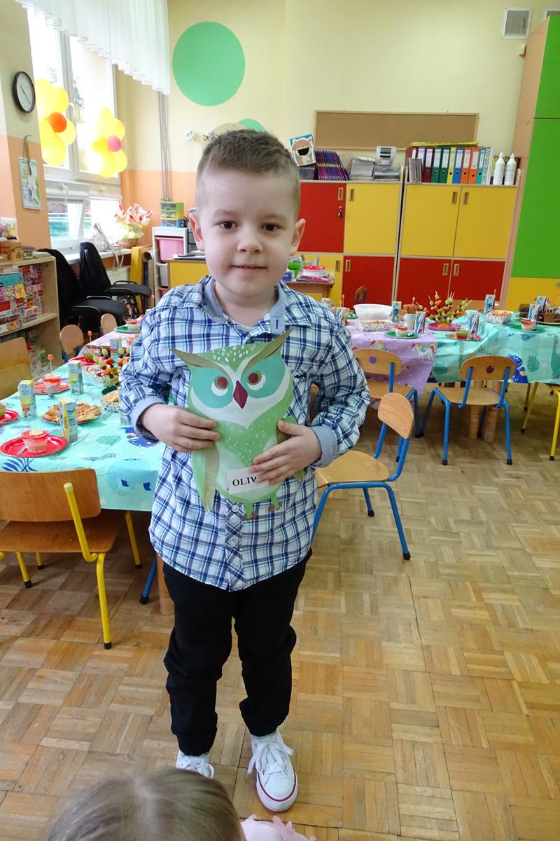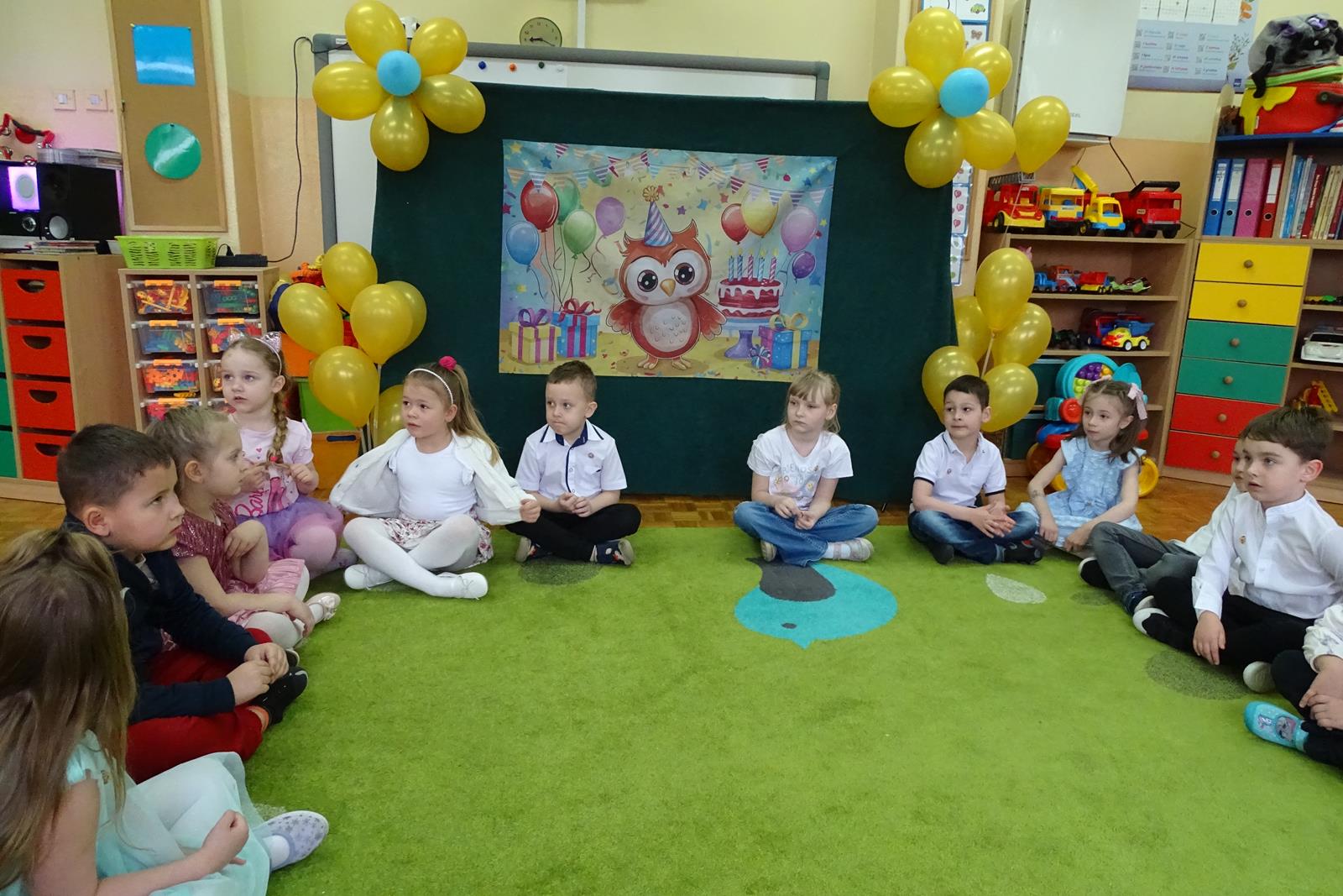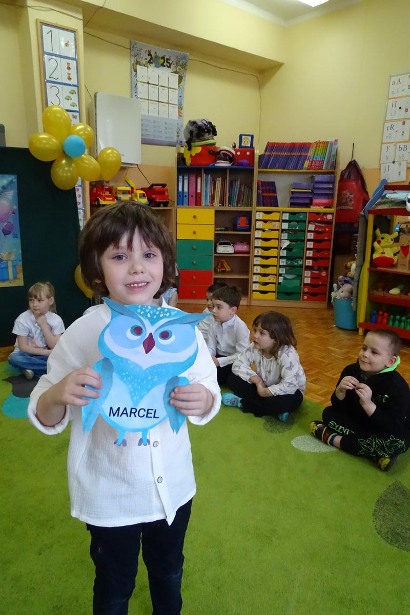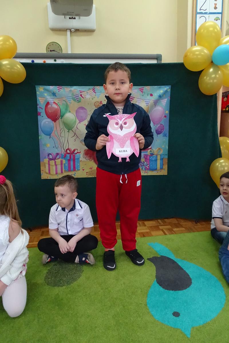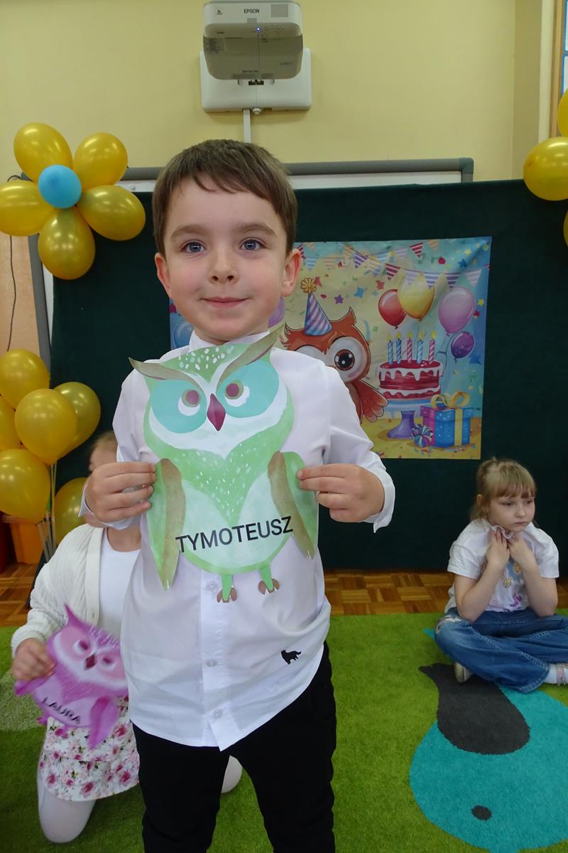 20 kwietnia w naszej sali zapanowała wyjątkowa atmosfera – świętowaliśmy Dzień Sowy, czyli urodziny naszej grupy „Sówki”! Był to dzień pełen radości, uśmiechów i wspólnego bycia razem. Dzieci przyszły odświętnie ubrane, co dodało wydarzeniu uroczystego charakteru. Ogromną niespodziankę przygotowali Rodzice – stoły wypełniły się pysznymi słodkościami i zdrowymi przekąskami, za co serdecznie dziękujemy!!! ;) Nie zabrakło także wspaniałych aktywności. Przedszkolaki z zaangażowaniem szukały sówek ze swoimi imionami, utrwalając przy tym czytanie globalne. Były radosne pląsy, zabawy ruchowe przy muzyce oraz gry integracyjne, które jeszcze bardziej zbliżyły naszą grupę. Wspólnie stworzyliśmy również dużą, sensoryczną sowę – symbol naszej grupy, która będzie przypominać nam o tym wyjątkowym dniu.