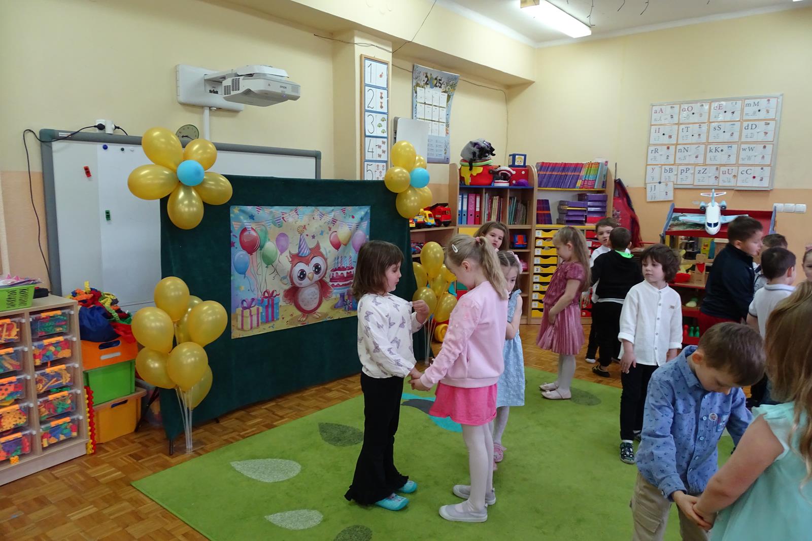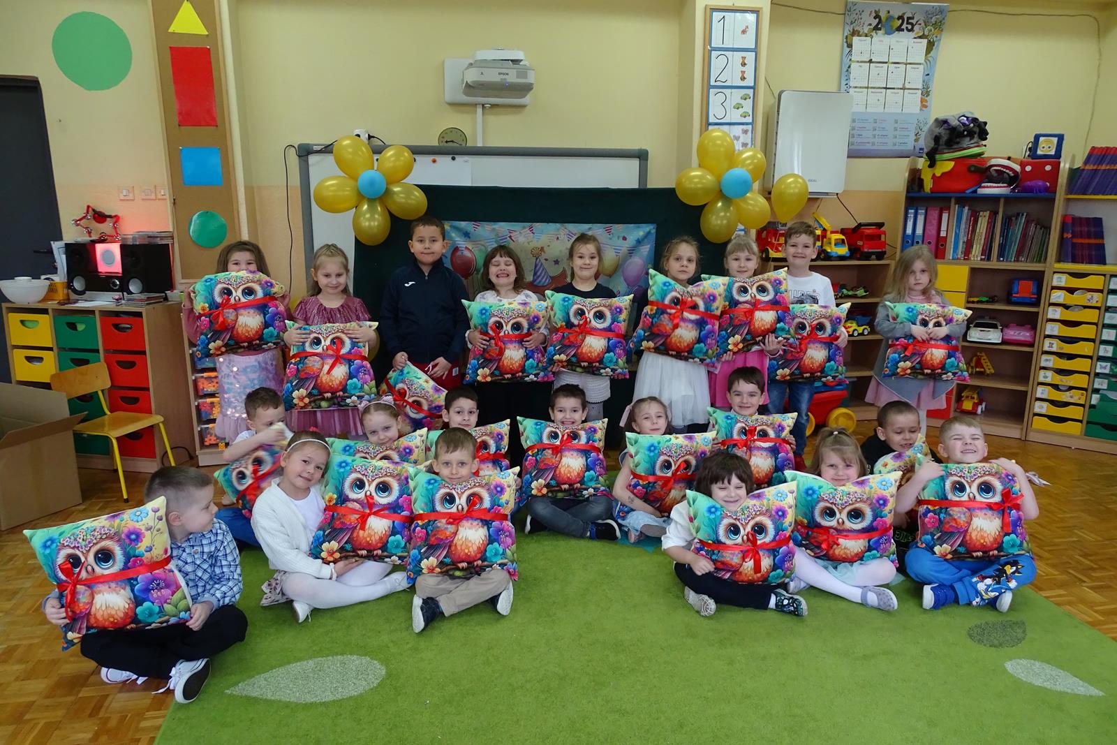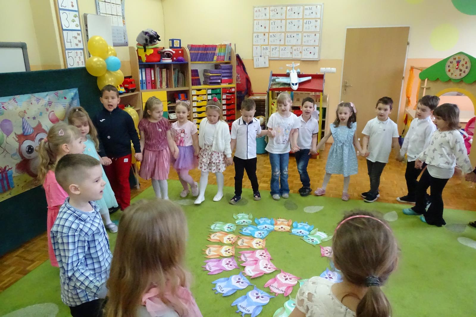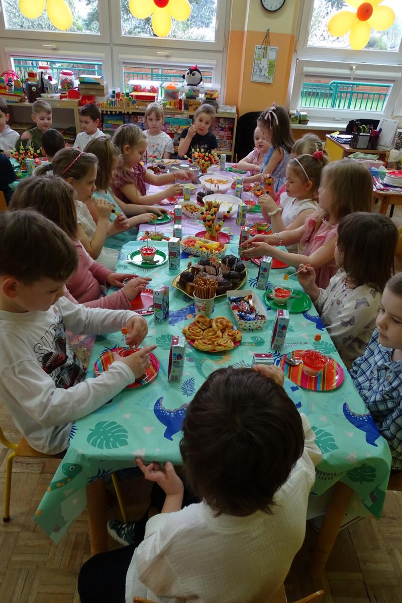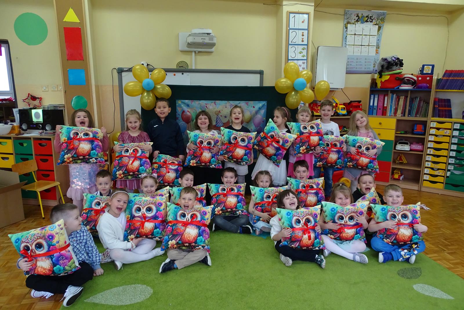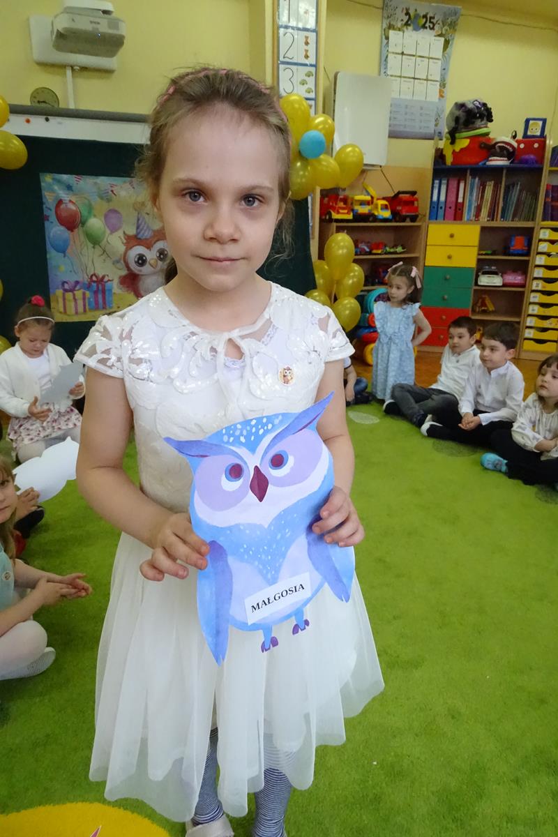 20 kwietnia w naszej sali zapanowała wyjątkowa atmosfera – świętowaliśmy Dzień Sowy, czyli urodziny naszej grupy „Sówki”! Był to dzień pełen radości, uśmiechów i wspólnego bycia razem. Dzieci przyszły odświętnie ubrane, co dodało wydarzeniu uroczystego charakteru. Ogromną niespodziankę przygotowali Rodzice – stoły wypełniły się pysznymi słodkościami i zdrowymi przekąskami, za co serdecznie dziękujemy!!! ;) Nie zabrakło także wspaniałych aktywności. Przedszkolaki z zaangażowaniem szukały sówek ze swoimi imionami, utrwalając przy tym czytanie globalne. Były radosne pląsy, zabawy ruchowe przy muzyce oraz gry integracyjne, które jeszcze bardziej zbliżyły naszą grupę. Wspólnie stworzyliśmy również dużą, sensoryczną sowę – symbol naszej grupy, która będzie przypominać nam o tym wyjątkowym dniu.