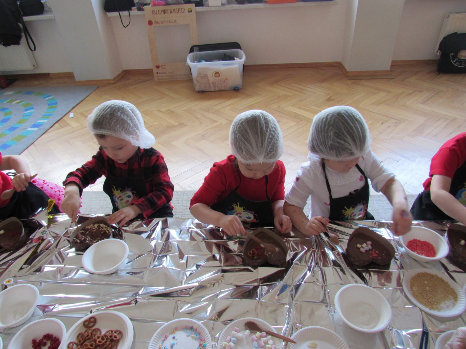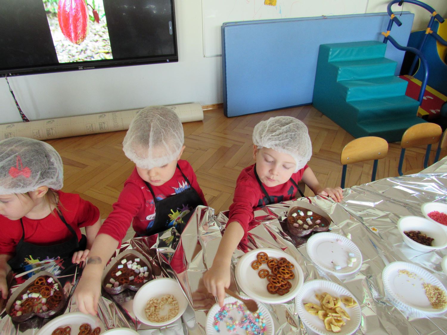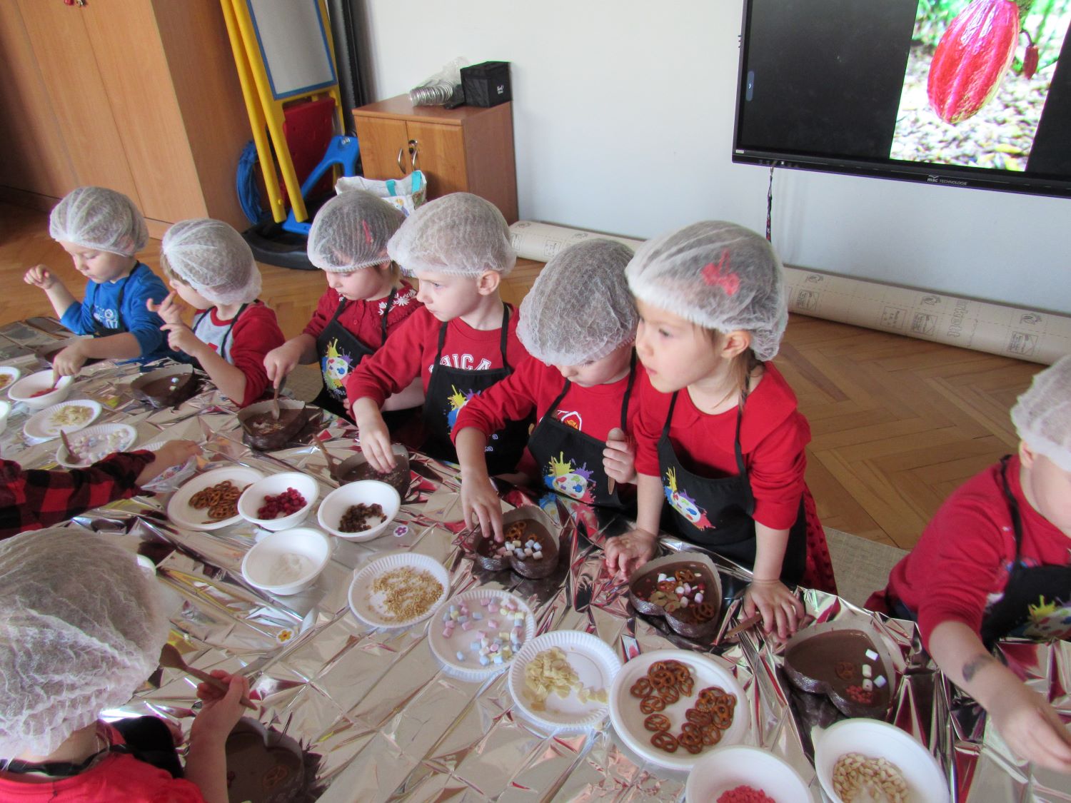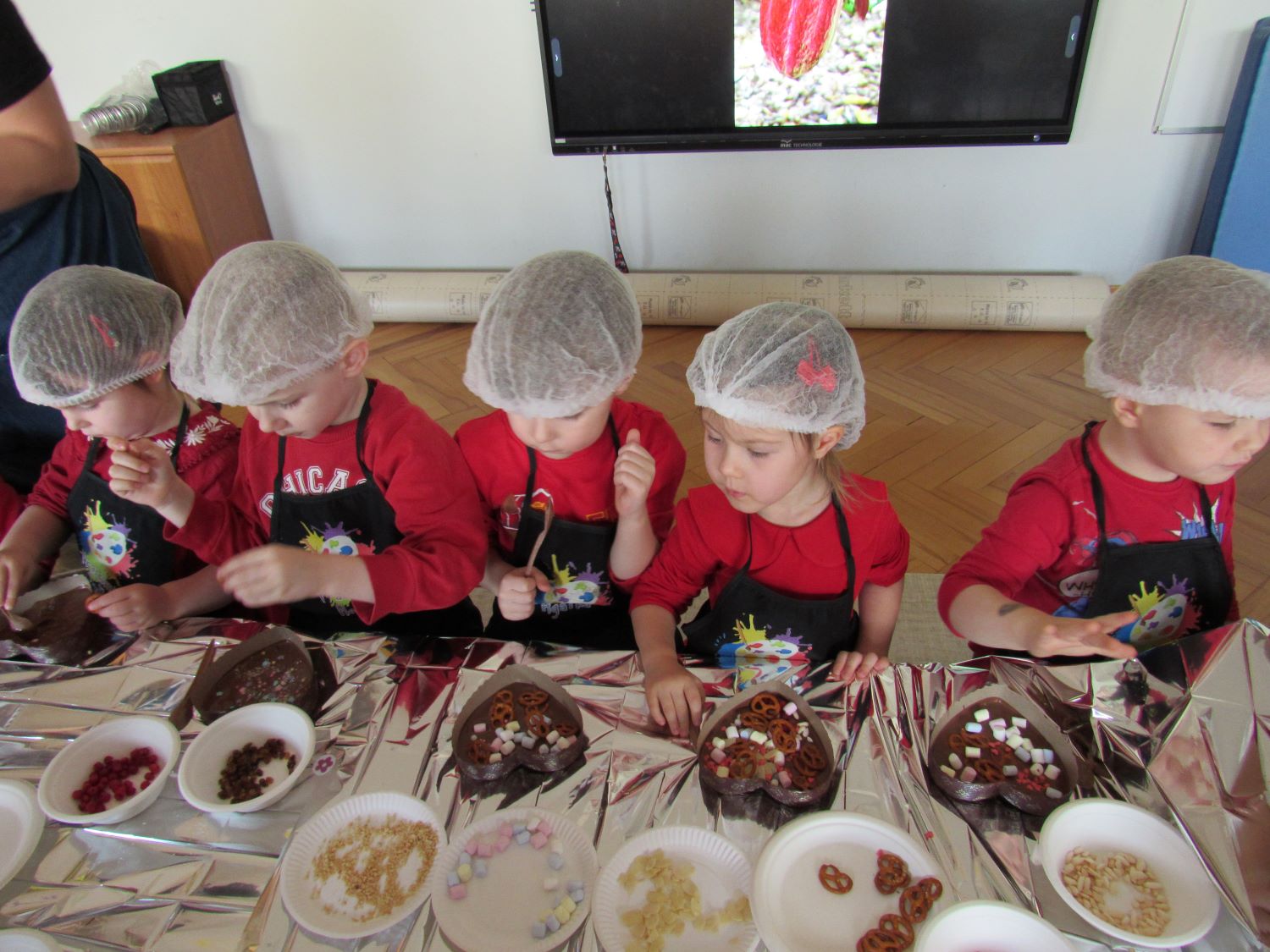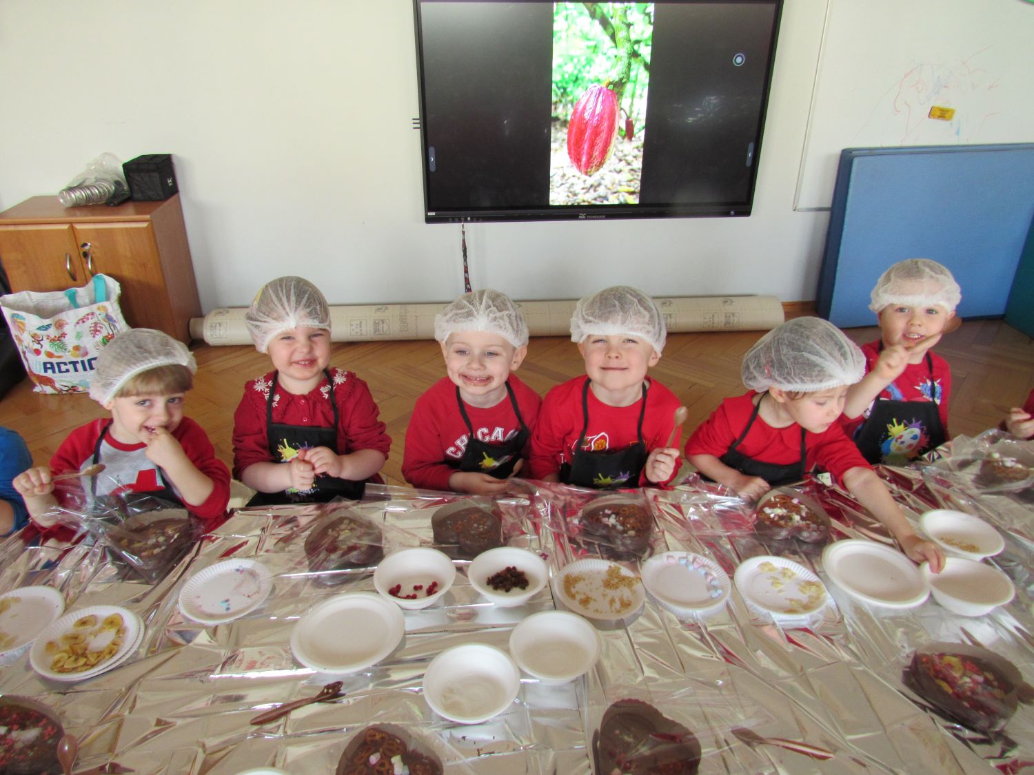 Warsztaty walentynkowe w naszym przedszkolu były pełne radości, słodkich zapachów i twórczej zabawy. Tego dnia dzieci przeniosły się w niezwykły świat czekolady. Dowiedziały się, skąd pochodzi czekolada oraz czym jest kakaowiec, poznaliśmy drzewo Theobroma - cacao, z którego ziaren powstaje ten pyszny przysmak. Przedszkolaki z zaciekawieniem słuchały opowieści o dalekich krajach, w których rośnie kakaowiec, i o tym, jak z ziaren powstaje tabliczka czekolady. Najwięcej radości sprawiły jednak warsztaty tworzenia walentynkowych czekoladek w kształcie serca. Dzieci samodzielnie przygotowywały słodkie serduszka, wykorzystując różnorodne, kolorowe posypki. Każda czekoladka była wyjątkowa, bogato udekorowana i przygotowana z ogromnym zaangażowaniem. Oczywiście nie zabrakło małych „degustatorów”, którzy z uśmiechem podjadali słodkości podczas pracy. Następnie przedszkolaki wykonały własnoręcznie serduszkowe przypinki, które stały się piękną pamiątką tego wyjątkowego dnia. Na zakończenie dzieci pomalowały walentynkowe serduszka czerwoną farbą, rozwijając swoją kreatywność i zdolności plastyczne.