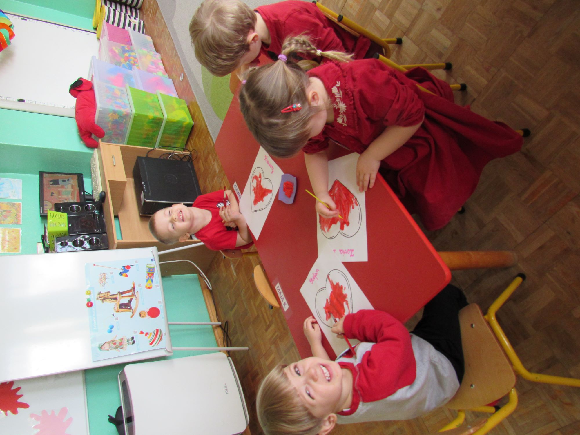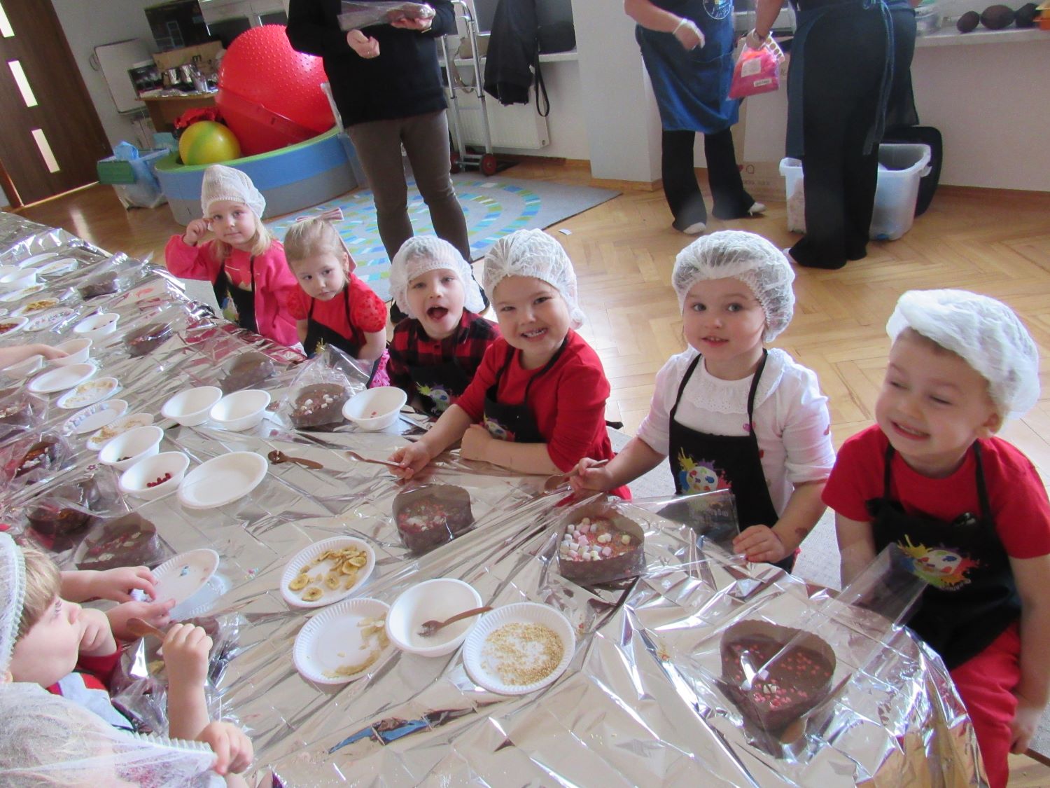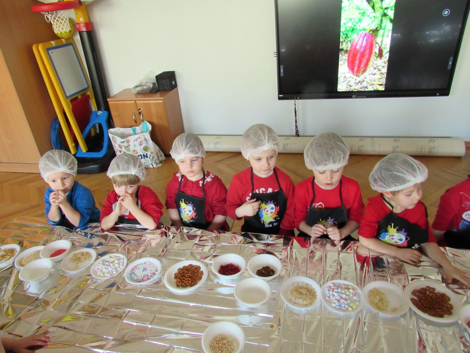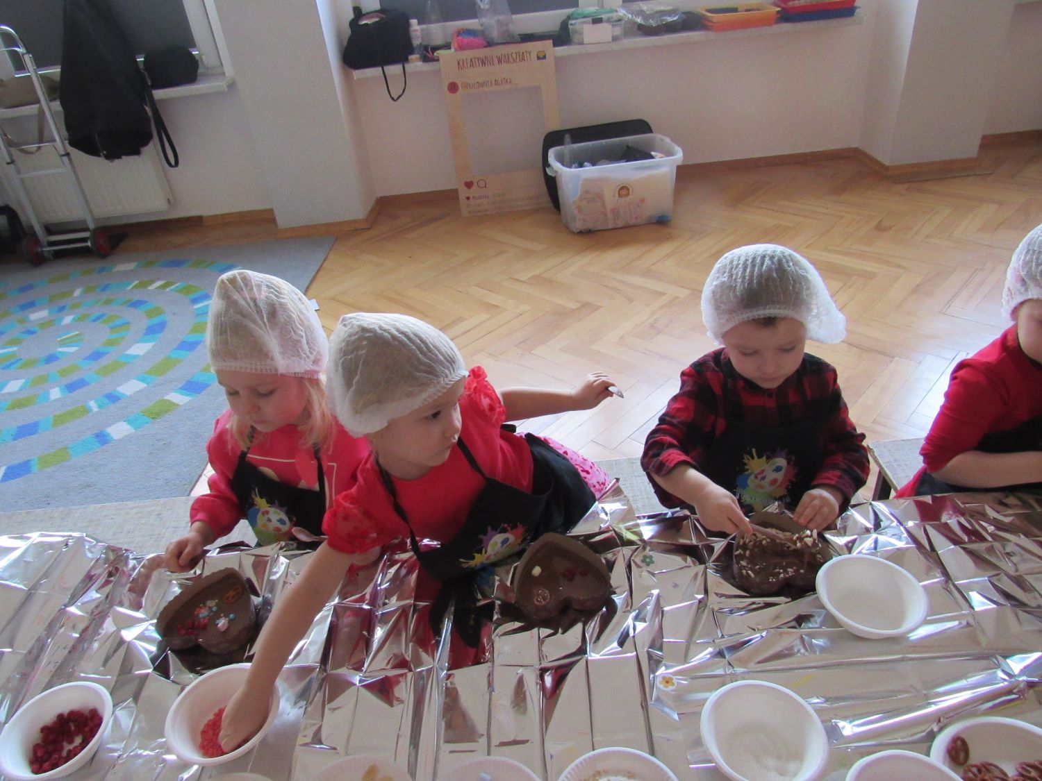 Warsztaty walentynkowe w naszym przedszkolu były pełne radości, słodkich zapachów i twórczej zabawy. Tego dnia dzieci przeniosły się w niezwykły świat czekolady. Dowiedziały się, skąd pochodzi czekolada oraz czym jest kakaowiec, poznaliśmy drzewo Theobroma - cacao, z którego ziaren powstaje ten pyszny przysmak. Przedszkolaki z zaciekawieniem słuchały opowieści o dalekich krajach, w których rośnie kakaowiec, i o tym, jak z ziaren powstaje tabliczka czekolady. Najwięcej radości sprawiły jednak warsztaty tworzenia walentynkowych czekoladek w kształcie serca. Dzieci samodzielnie przygotowywały słodkie serduszka, wykorzystując różnorodne, kolorowe posypki. Każda czekoladka była wyjątkowa, bogato udekorowana i przygotowana z ogromnym zaangażowaniem. Oczywiście nie zabrakło małych „degustatorów”, którzy z uśmiechem podjadali słodkości podczas pracy. Następnie przedszkolaki wykonały własnoręcznie serduszkowe przypinki, które stały się piękną pamiątką tego wyjątkowego dnia. Na zakończenie dzieci pomalowały walentynkowe serduszka czerwoną farbą, rozwijając swoją kreatywność i zdolności plastyczne.