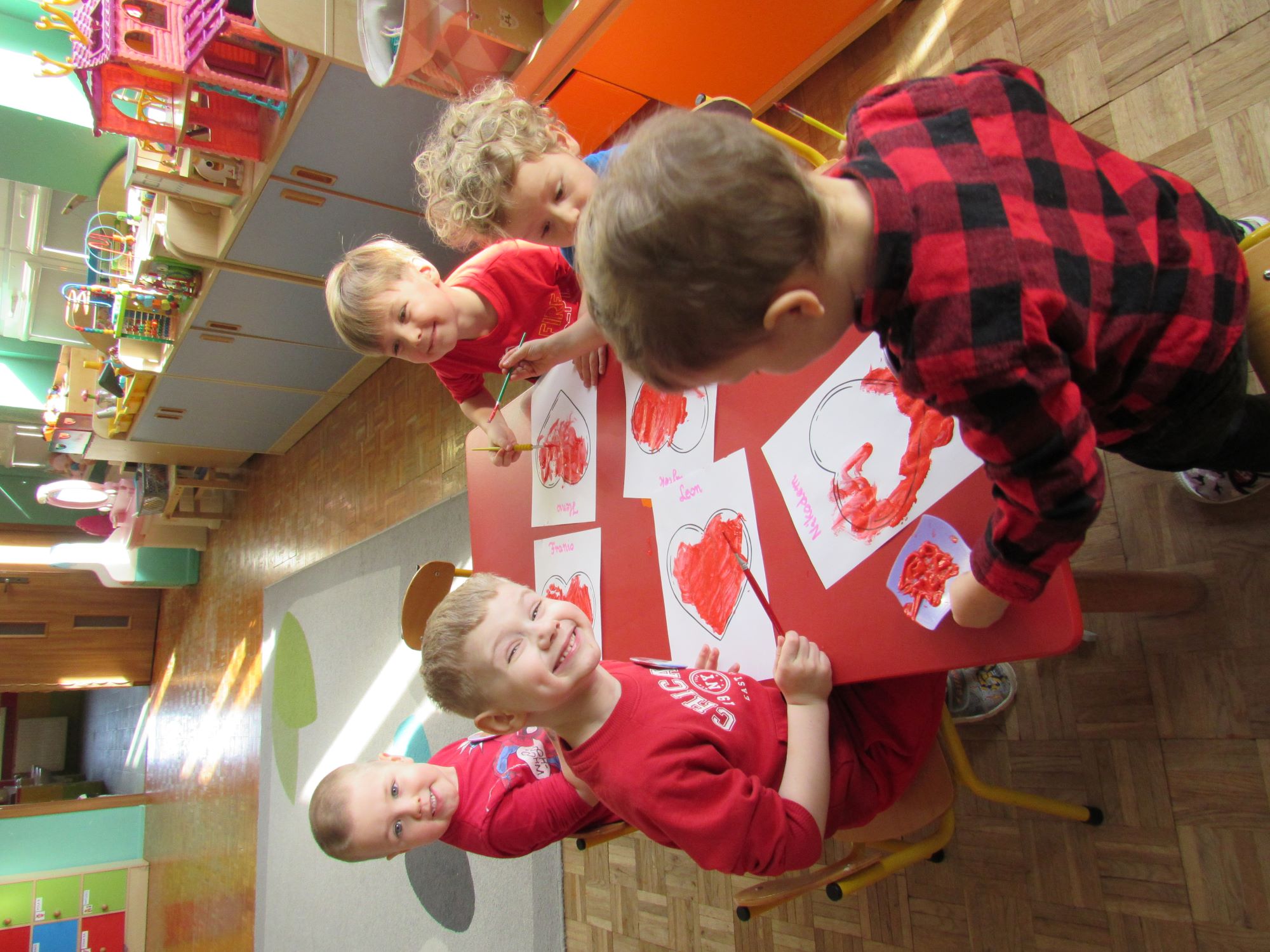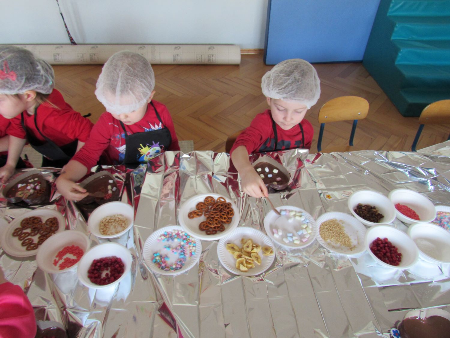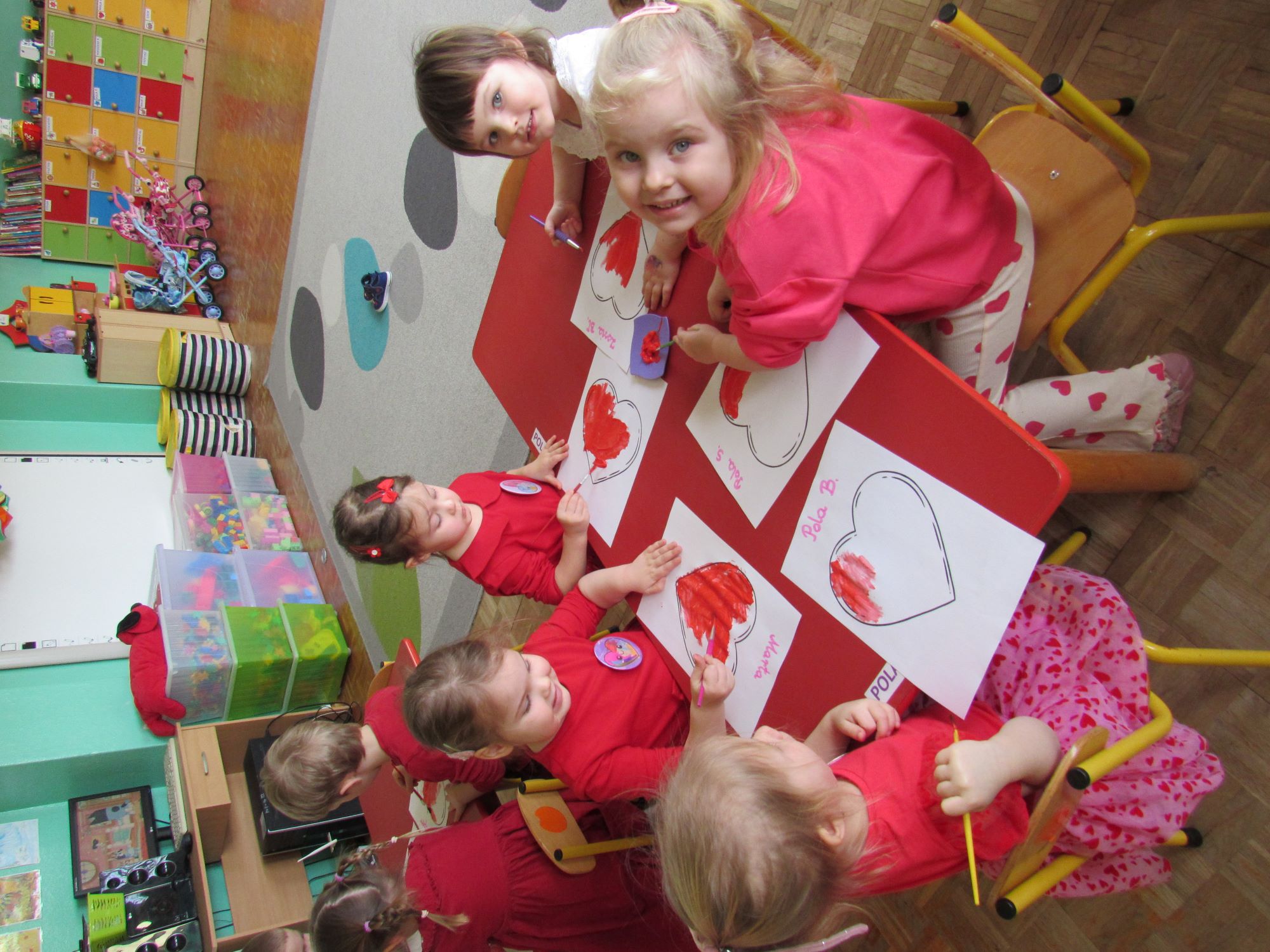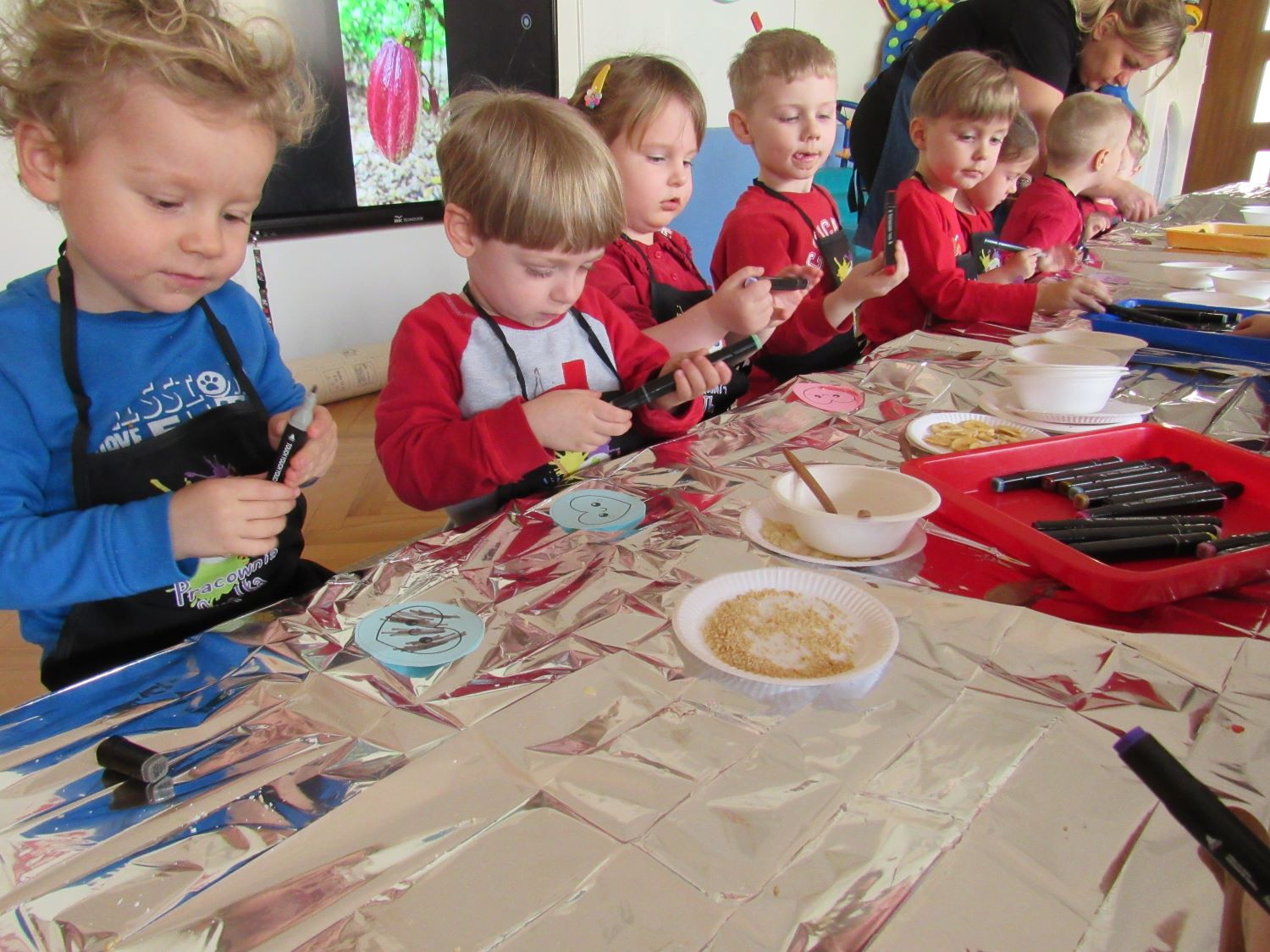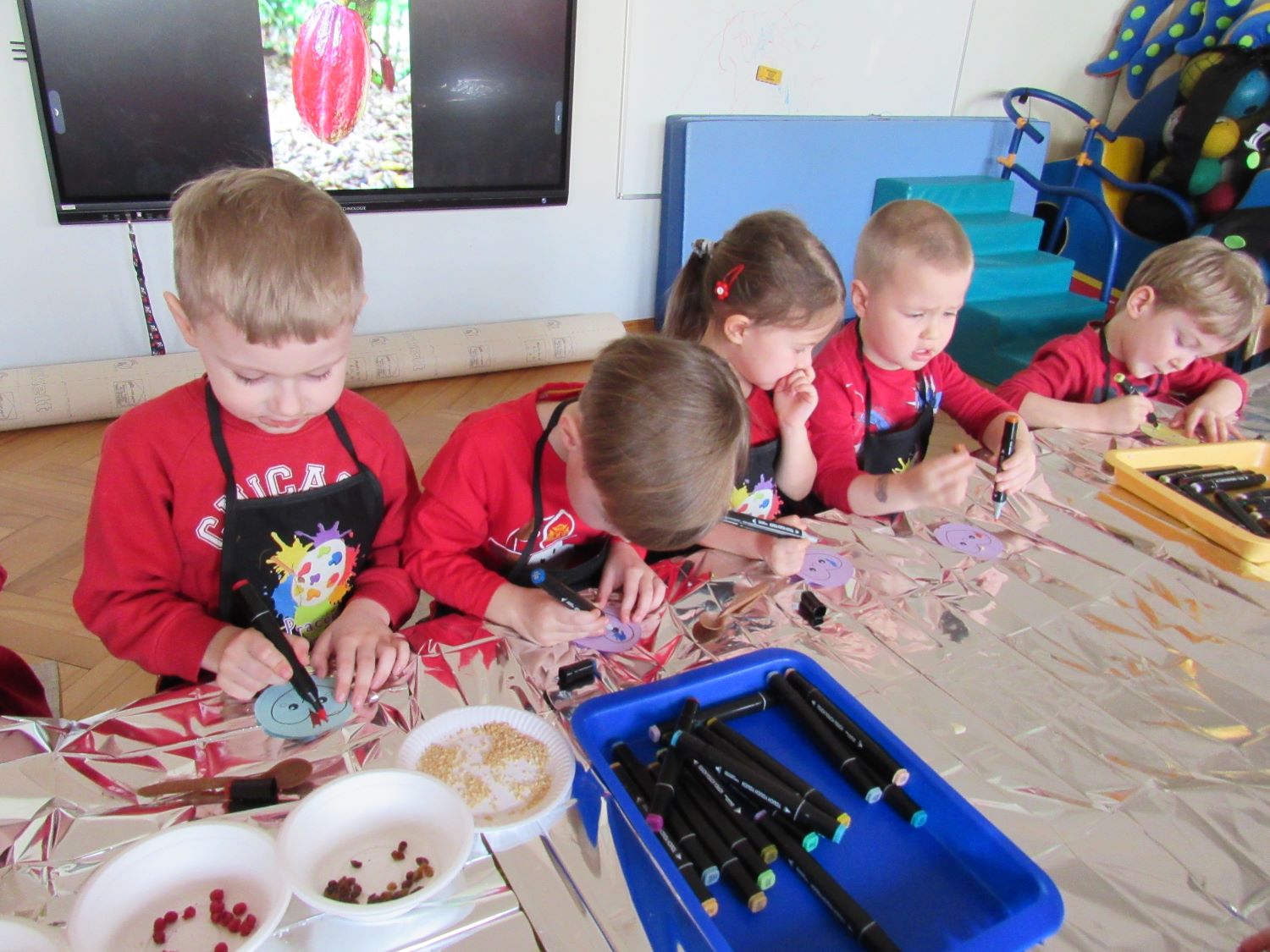 Warsztaty walentynkowe w naszym przedszkolu były pełne radości, słodkich zapachów i twórczej zabawy. Tego dnia dzieci przeniosły się w niezwykły świat czekolady. Dowiedziały się, skąd pochodzi czekolada oraz czym jest kakaowiec, poznaliśmy drzewo Theobroma - cacao, z którego ziaren powstaje ten pyszny przysmak. Przedszkolaki z zaciekawieniem słuchały opowieści o dalekich krajach, w których rośnie kakaowiec, i o tym, jak z ziaren powstaje tabliczka czekolady. Najwięcej radości sprawiły jednak warsztaty tworzenia walentynkowych czekoladek w kształcie serca. Dzieci samodzielnie przygotowywały słodkie serduszka, wykorzystując różnorodne, kolorowe posypki. Każda czekoladka była wyjątkowa, bogato udekorowana i przygotowana z ogromnym zaangażowaniem. Oczywiście nie zabrakło małych „degustatorów”, którzy z uśmiechem podjadali słodkości podczas pracy. Następnie przedszkolaki wykonały własnoręcznie serduszkowe przypinki, które stały się piękną pamiątką tego wyjątkowego dnia. Na zakończenie dzieci pomalowały walentynkowe serduszka czerwoną farbą, rozwijając swoją kreatywność i zdolności plastyczne.