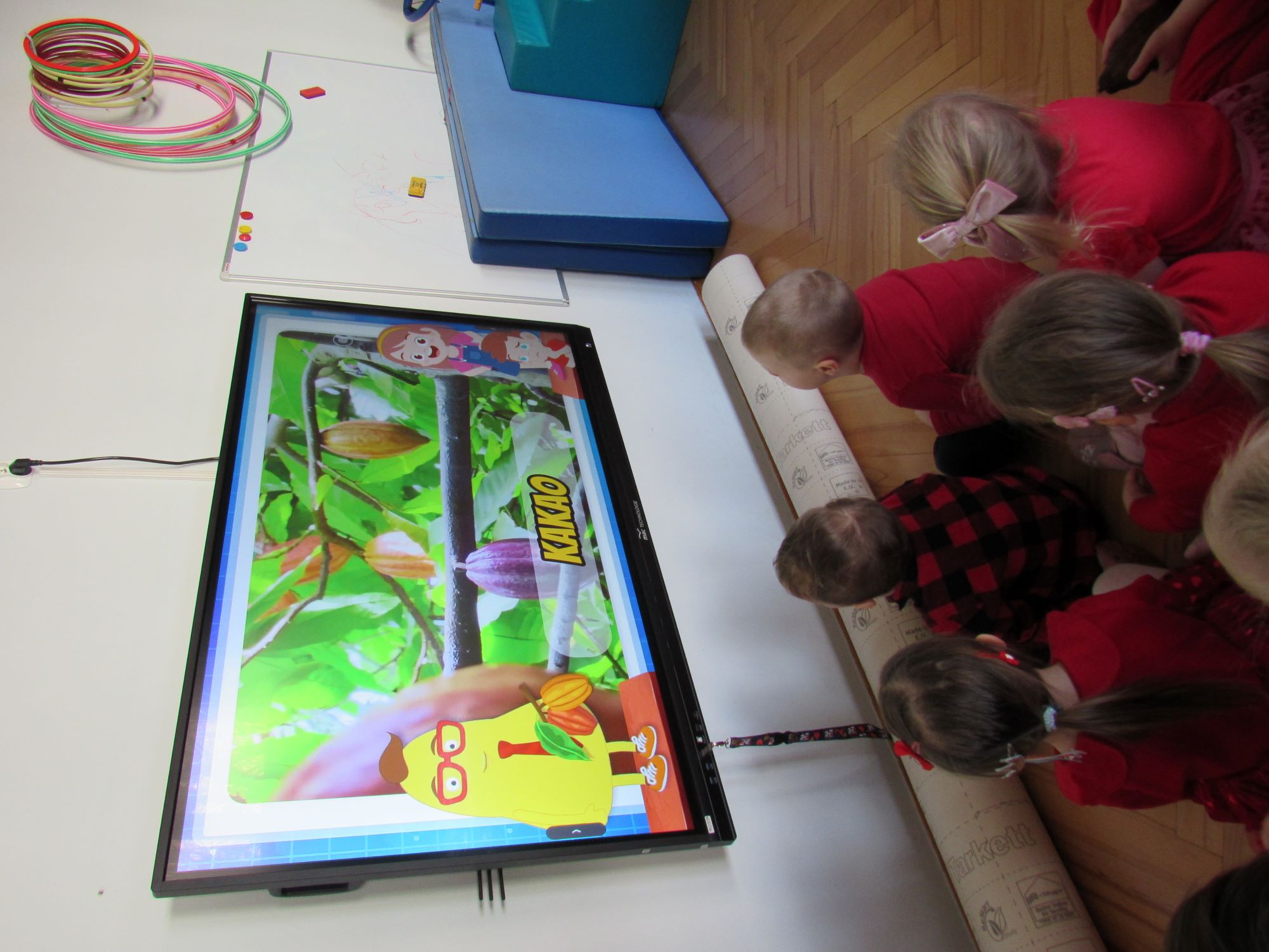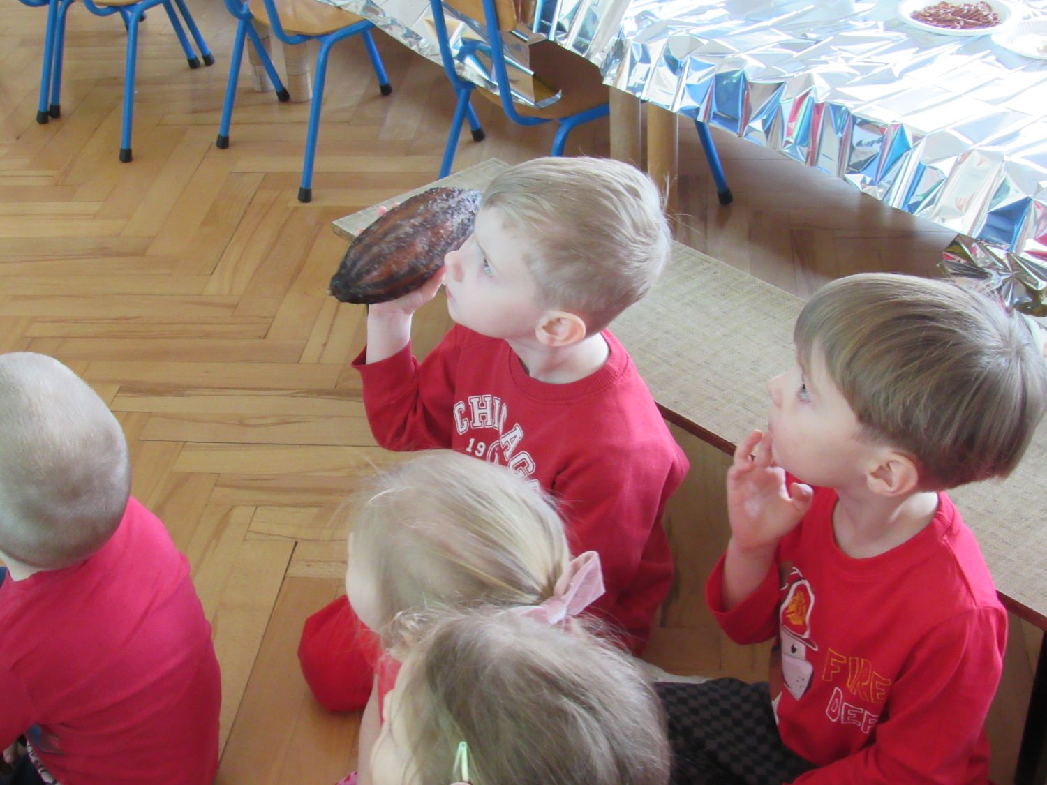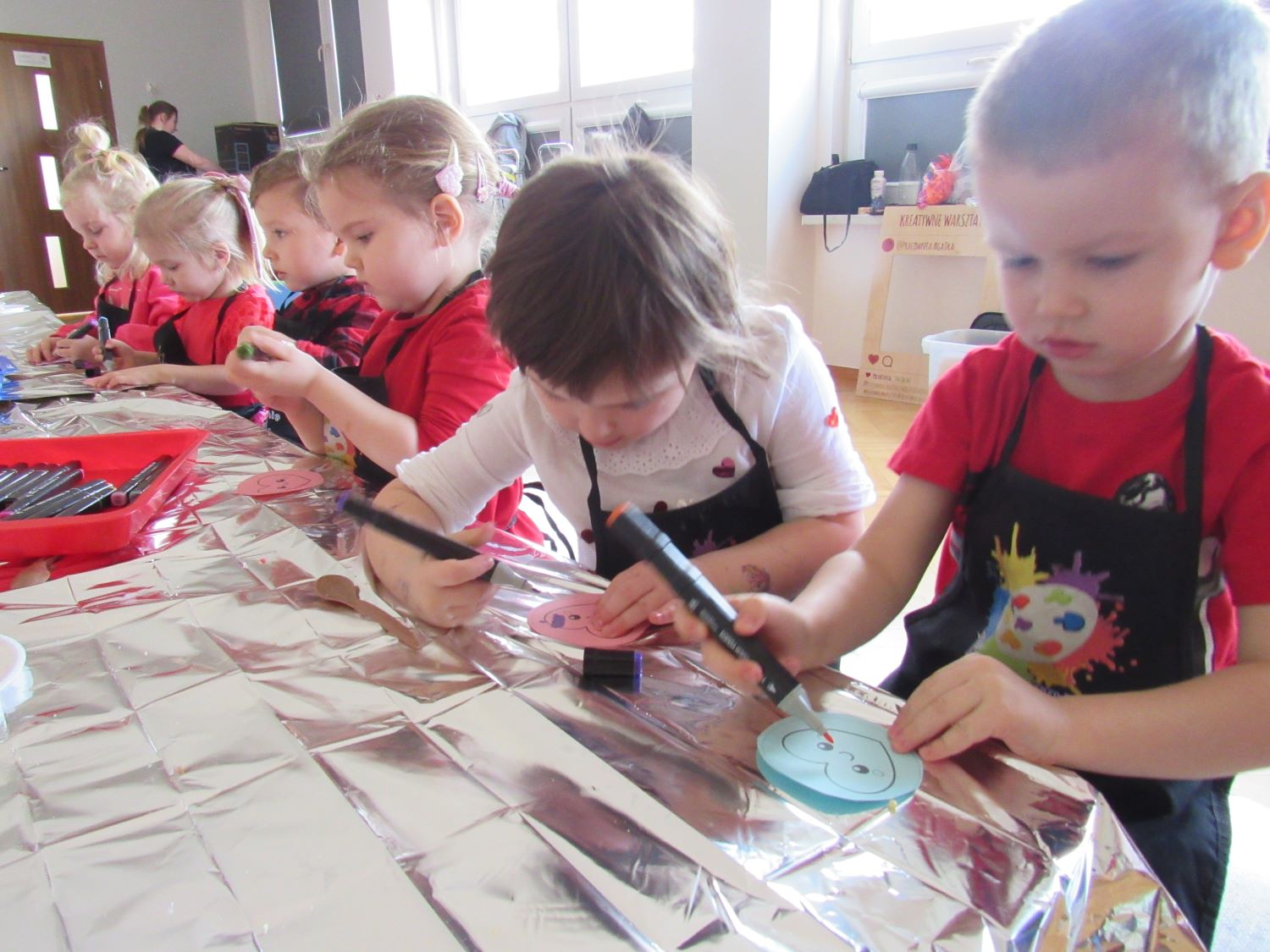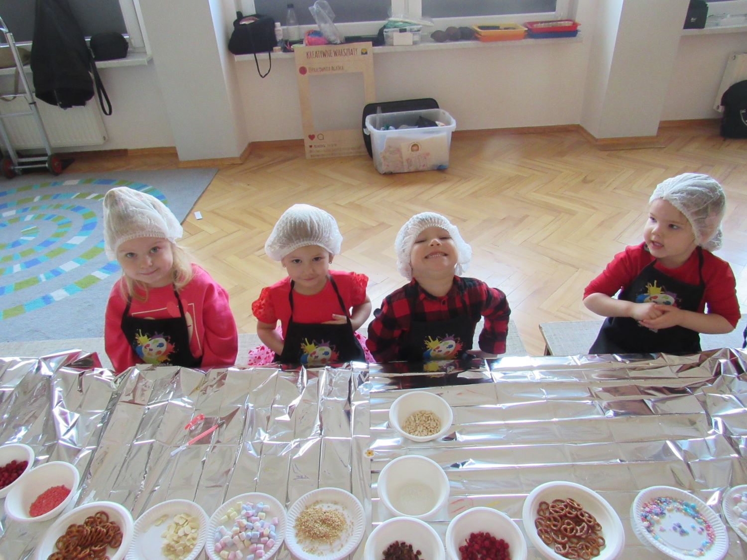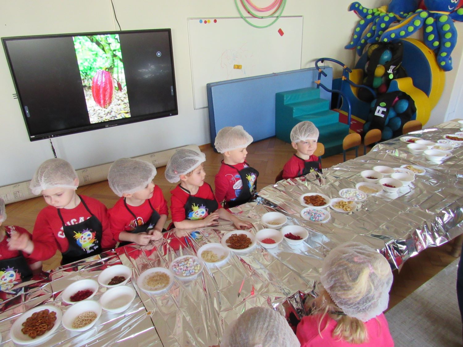 Warsztaty walentynkowe w naszym przedszkolu były pełne radości, słodkich zapachów i twórczej zabawy. Tego dnia dzieci przeniosły się w niezwykły świat czekolady. Dowiedziały się, skąd pochodzi czekolada oraz czym jest kakaowiec, poznaliśmy drzewo Theobroma - cacao, z którego ziaren powstaje ten pyszny przysmak. Przedszkolaki z zaciekawieniem słuchały opowieści o dalekich krajach, w których rośnie kakaowiec, i o tym, jak z ziaren powstaje tabliczka czekolady. Najwięcej radości sprawiły jednak warsztaty tworzenia walentynkowych czekoladek w kształcie serca. Dzieci samodzielnie przygotowywały słodkie serduszka, wykorzystując różnorodne, kolorowe posypki. Każda czekoladka była wyjątkowa, bogato udekorowana i przygotowana z ogromnym zaangażowaniem. Oczywiście nie zabrakło małych „degustatorów”, którzy z uśmiechem podjadali słodkości podczas pracy. Następnie przedszkolaki wykonały własnoręcznie serduszkowe przypinki, które stały się piękną pamiątką tego wyjątkowego dnia. Na zakończenie dzieci pomalowały walentynkowe serduszka czerwoną farbą, rozwijając swoją kreatywność i zdolności plastyczne.