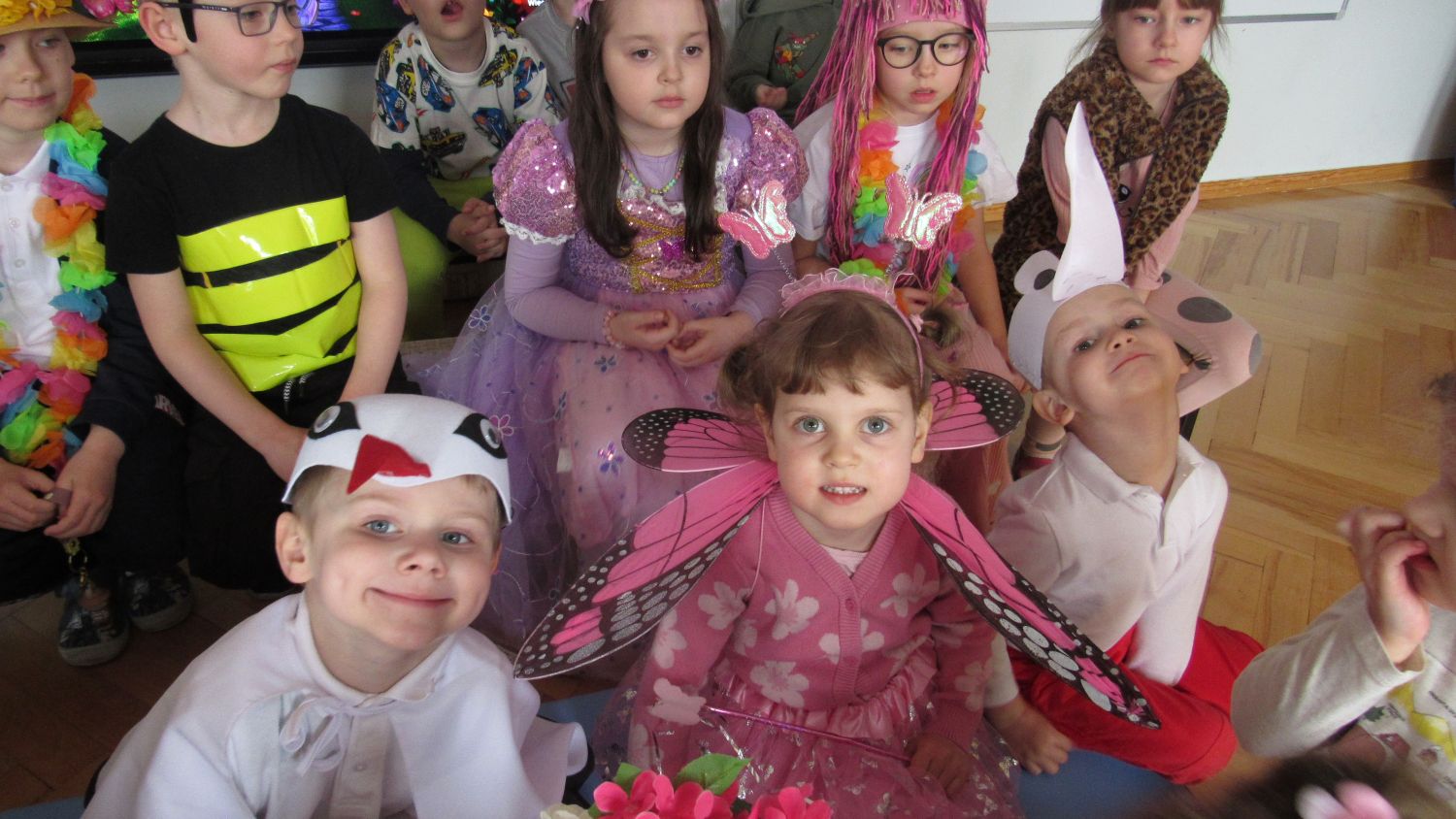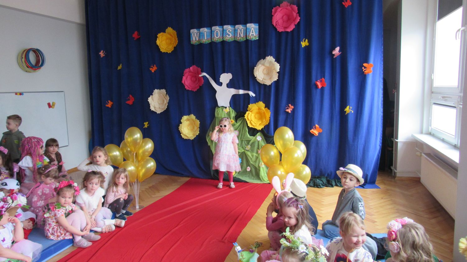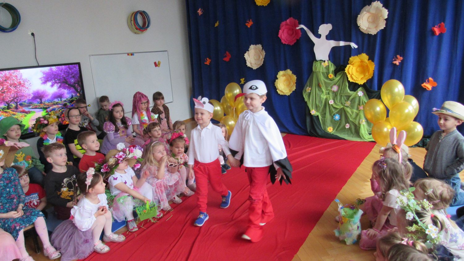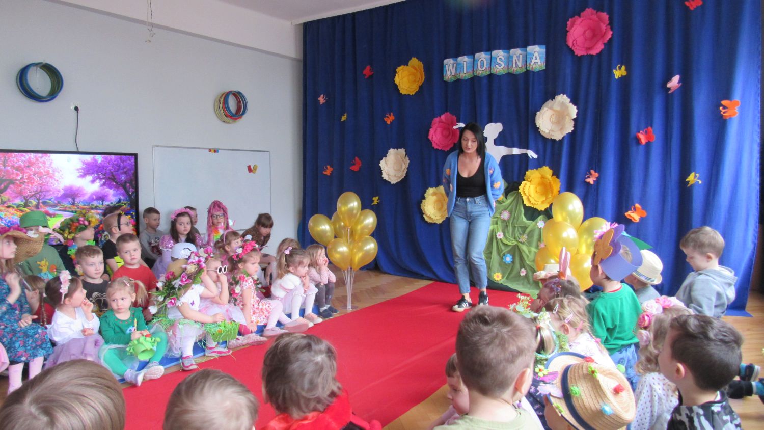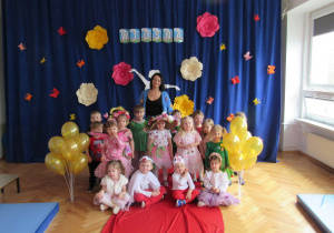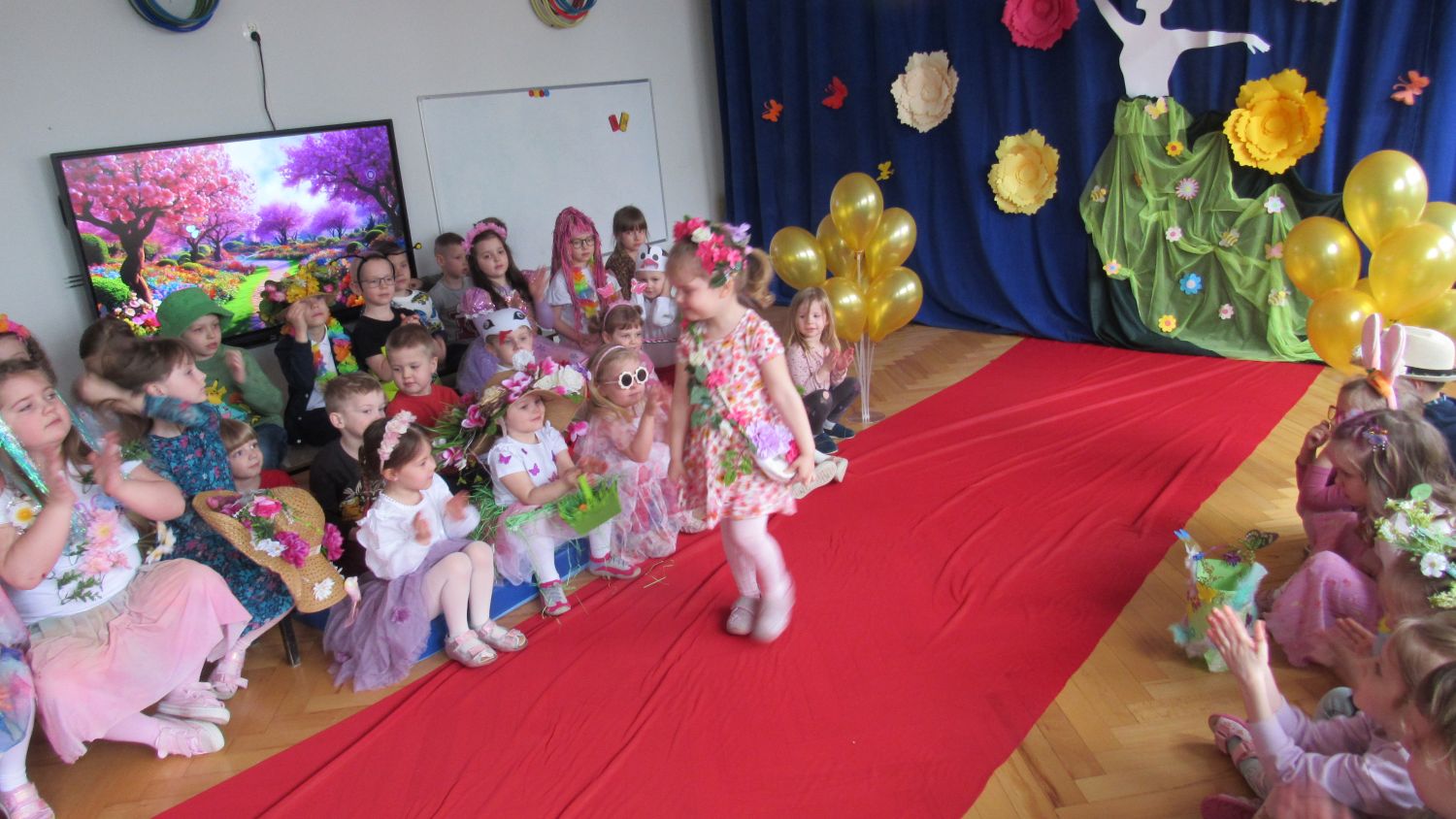 Pierwszego dnia wiosny w przedszkolu panowała radosna i kolorowa atmosfera. Dzieci z entuzjazmem powitały nową porę roku, biorąc udział w wielu ciekawych aktywnościach. Jednym z najważniejszych wydarzeń był pokaz mody, podczas którego mali uczestnicy zaprezentowali swoje najpiękniejsze wiosenne stroje pełne barw, kwiatów i lekkich tkanin. Przedszkolaki rozwijały również swoją kreatywność, malując kwiaty, które następnie ozdobiły korytarze przedszkola, wprowadzając do nich prawdziwie wiosenny klimat. Nie zabrakło także zabaw ruchowych, dzieci z radością „łowiły rybki”, nawijając wędkę na rękę, co sprawiło im wiele śmiechu i satysfakcji. Wspólne śpiewanie wiosennych piosenek było okazją do przywołania Pani Wiosny i jeszcze większego poczucia radości z nadejścia cieplejszych dni. To był dzień pełen uśmiechów, zabawy i pozytywnej energii.