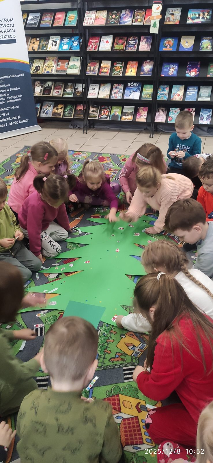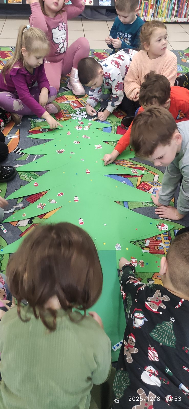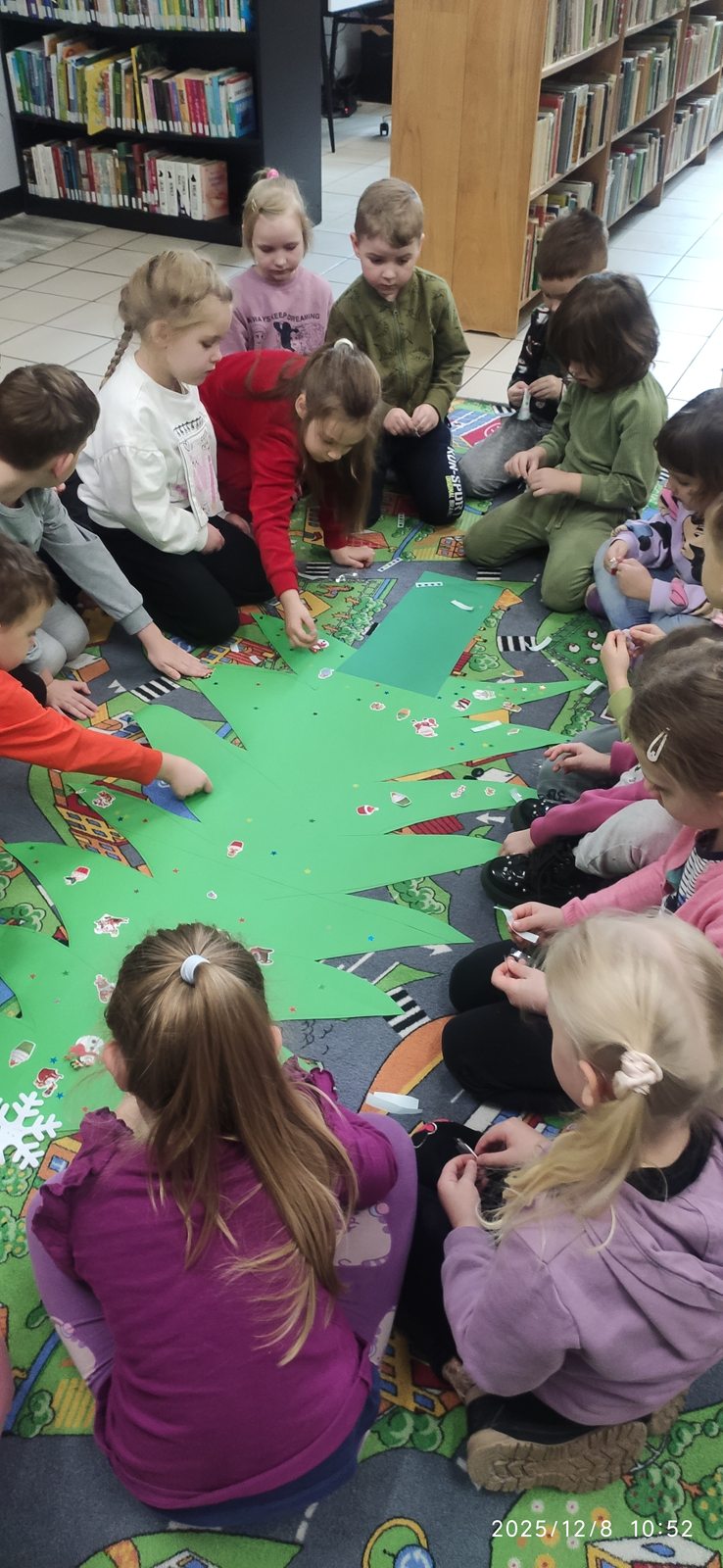 8 grudnia mieliśmy ogromną przyjemność odwiedzić Bibliotekę Pedagogiczną w Zduńskiej Woli, która specjalnie dla nas zamieniła się w prawdziwą, zimową Krainę. Już od progu czekała na dzieci wyjątkowa, bajkowa atmosfera, która wprowadziła wszystkich w klimat nadchodzących świąt. Sówki wyruszyły w niezwykłą podróż pełną opowieści i zimowych historii rozgrzewających serca nawet w najbardziej mroźny dzień. Podczas spotkania dzieci wysłuchały pięknej bajki pt.: „Pani Zamieć” braci Grimm, przedstawionej w formie teatru kamishibai. Ta niezwykła prezentacja oczarowała wszystkich małych słuchaczy i wspaniale pobudziła ich wyobraźnię Po bajkowej przygodzie przyszedł czas na twórczą zabawę – wspólnie stworzyliśmy barwną, papierową choinkę pełną dziecięcych życzeń, marzeń i uśmiechów. Efekt końcowy był naprawdę wyjątkowy! Nasz świąteczny kolaż przypomina, jak wiele radości potrafią wnieść dziecięca kreatywność i otwartość, zwłaszcza w tym pięknym, magicznym czasie.