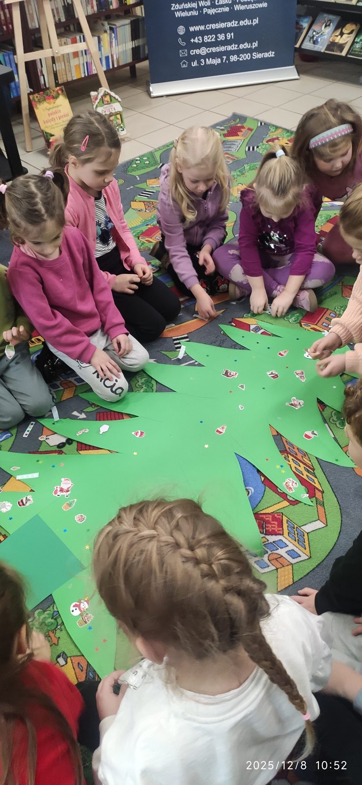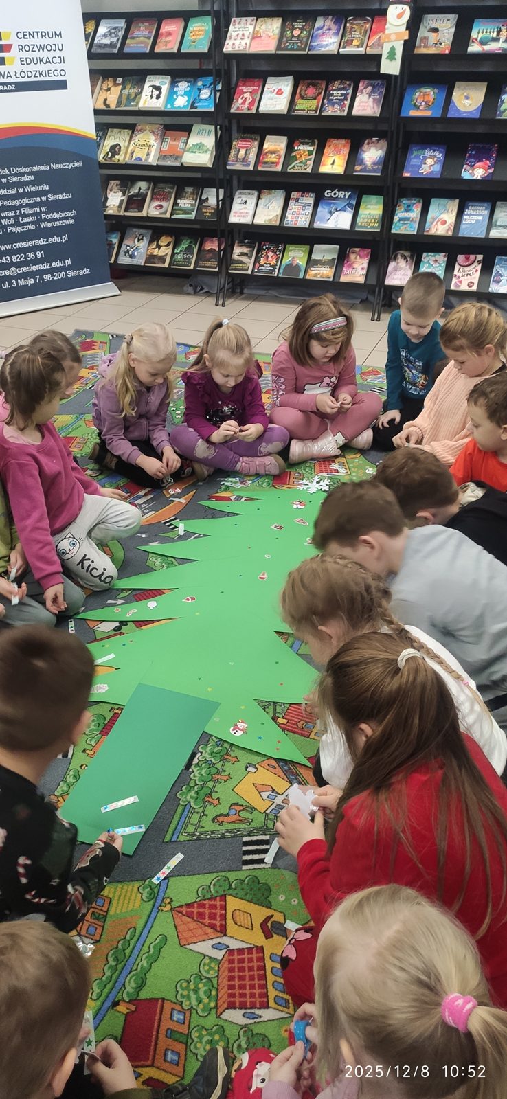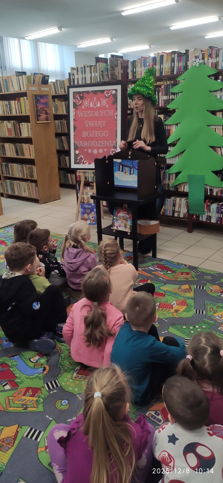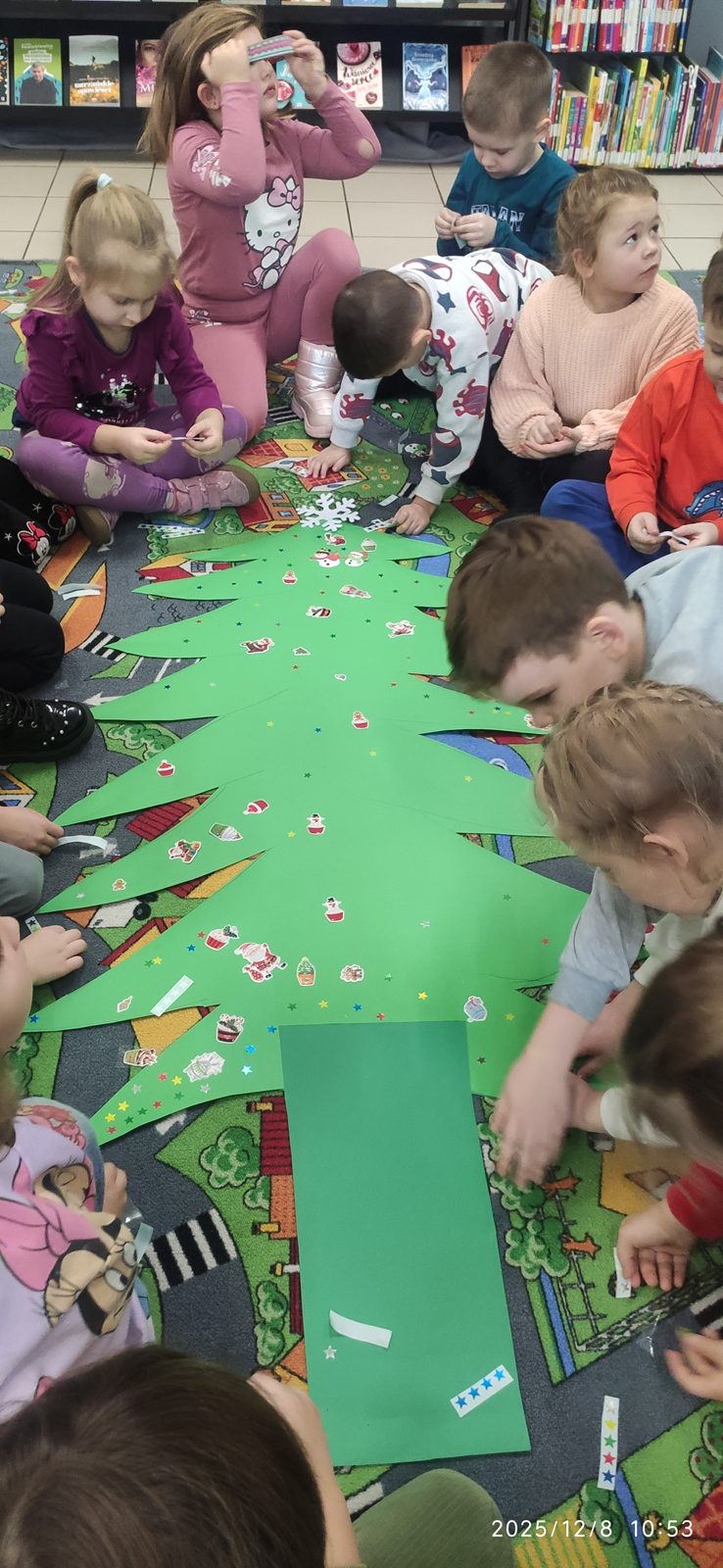 8 grudnia mieliśmy ogromną przyjemność odwiedzić Bibliotekę Pedagogiczną w Zduńskiej Woli, która specjalnie dla nas zamieniła się w prawdziwą, zimową Krainę. Już od progu czekała na dzieci wyjątkowa, bajkowa atmosfera, która wprowadziła wszystkich w klimat nadchodzących świąt. Sówki wyruszyły w niezwykłą podróż pełną opowieści i zimowych historii rozgrzewających serca nawet w najbardziej mroźny dzień. Podczas spotkania dzieci wysłuchały pięknej bajki pt.: „Pani Zamieć” braci Grimm, przedstawionej w formie teatru kamishibai. Ta niezwykła prezentacja oczarowała wszystkich małych słuchaczy i wspaniale pobudziła ich wyobraźnię Po bajkowej przygodzie przyszedł czas na twórczą zabawę – wspólnie stworzyliśmy barwną, papierową choinkę pełną dziecięcych życzeń, marzeń i uśmiechów. Efekt końcowy był naprawdę wyjątkowy! Nasz świąteczny kolaż przypomina, jak wiele radości potrafią wnieść dziecięca kreatywność i otwartość, zwłaszcza w tym pięknym, magicznym czasie.