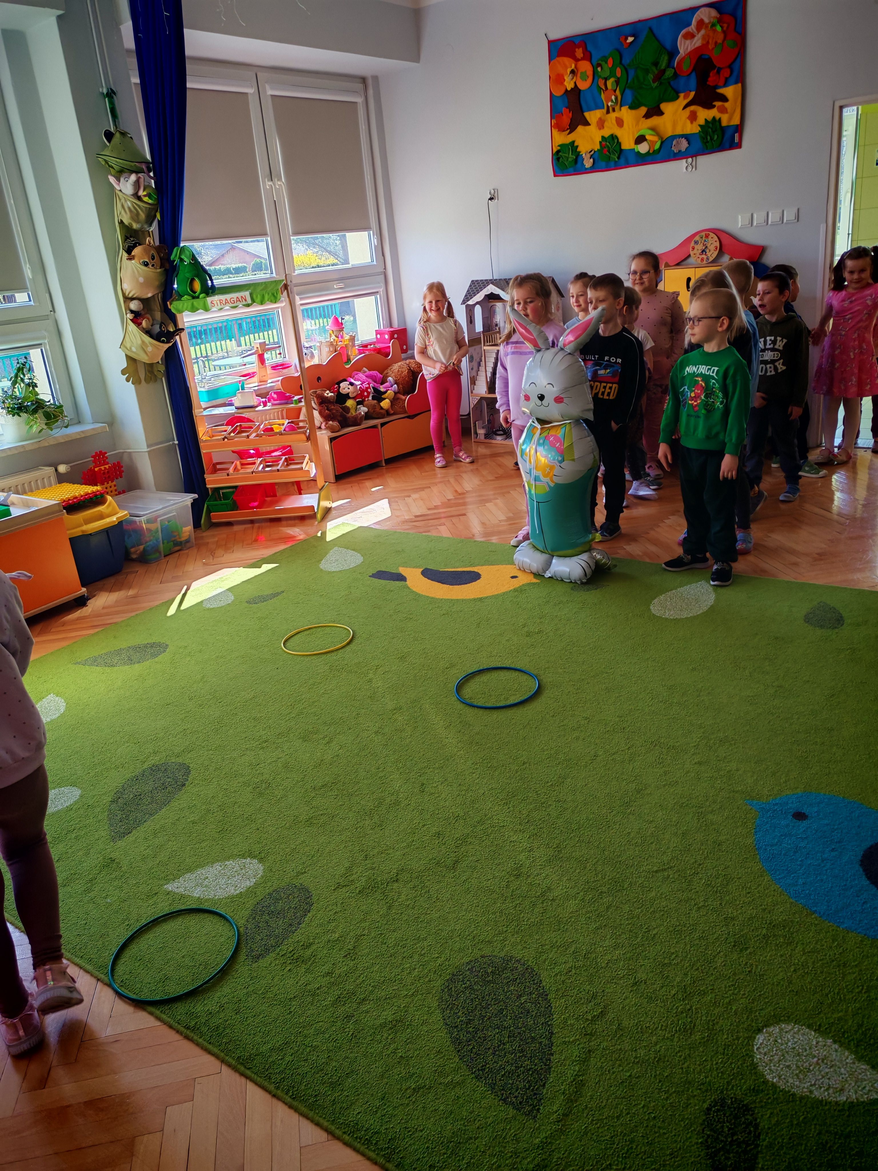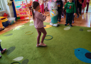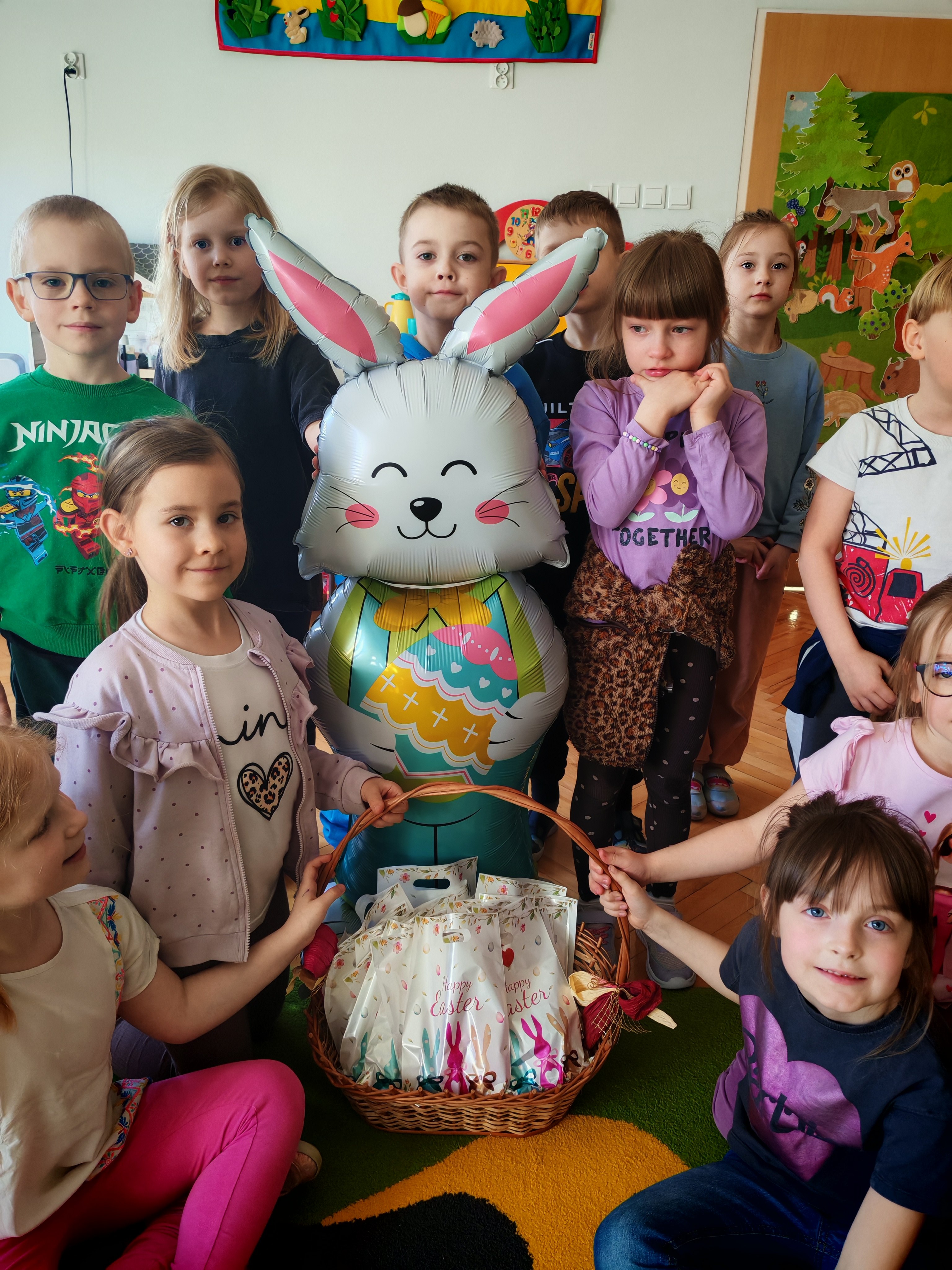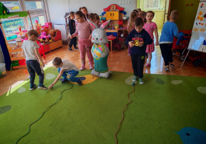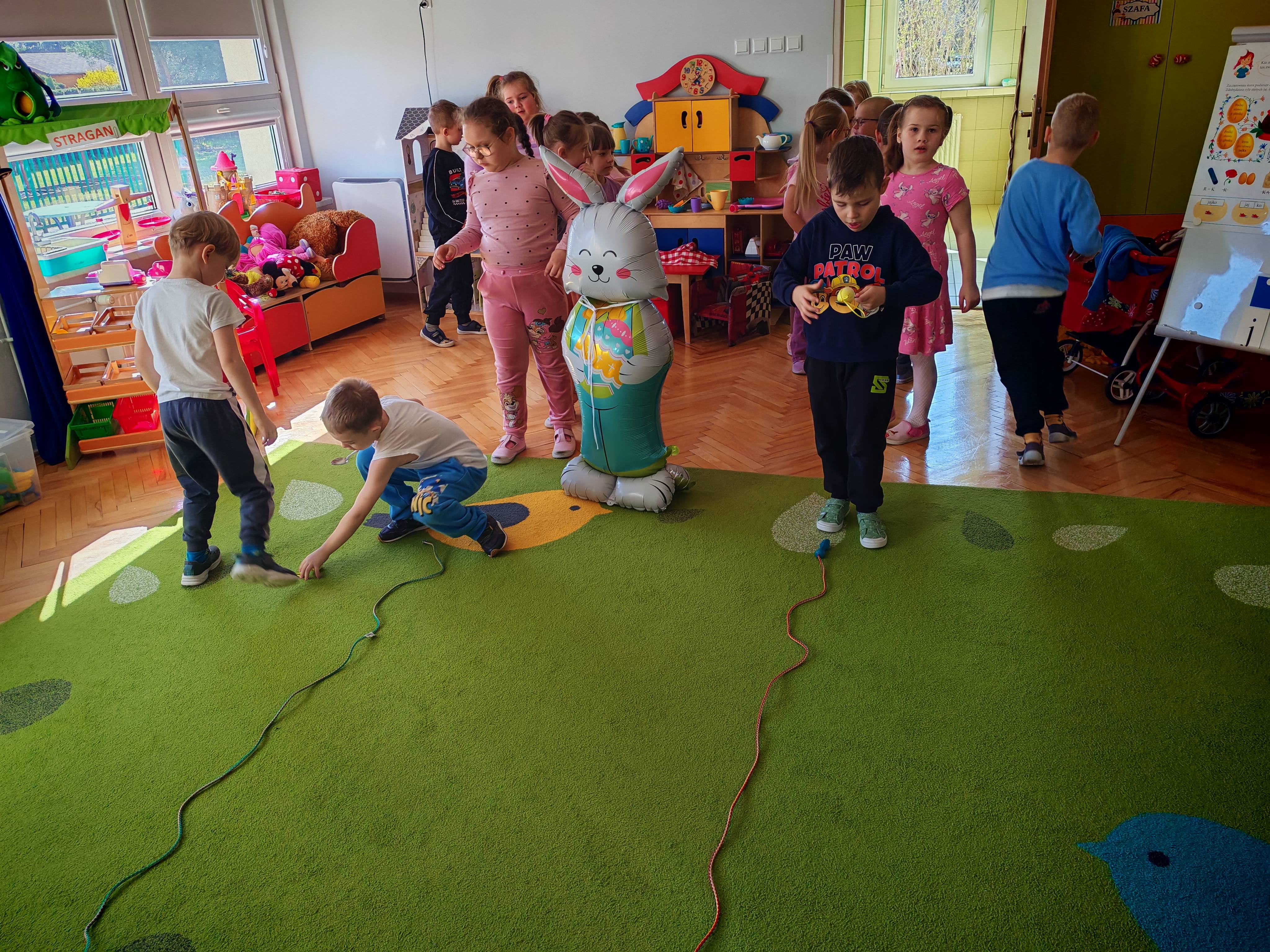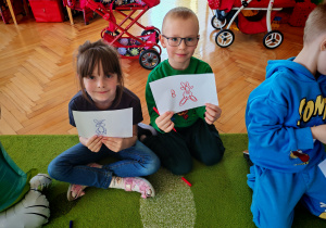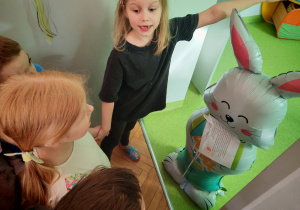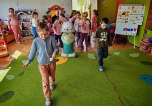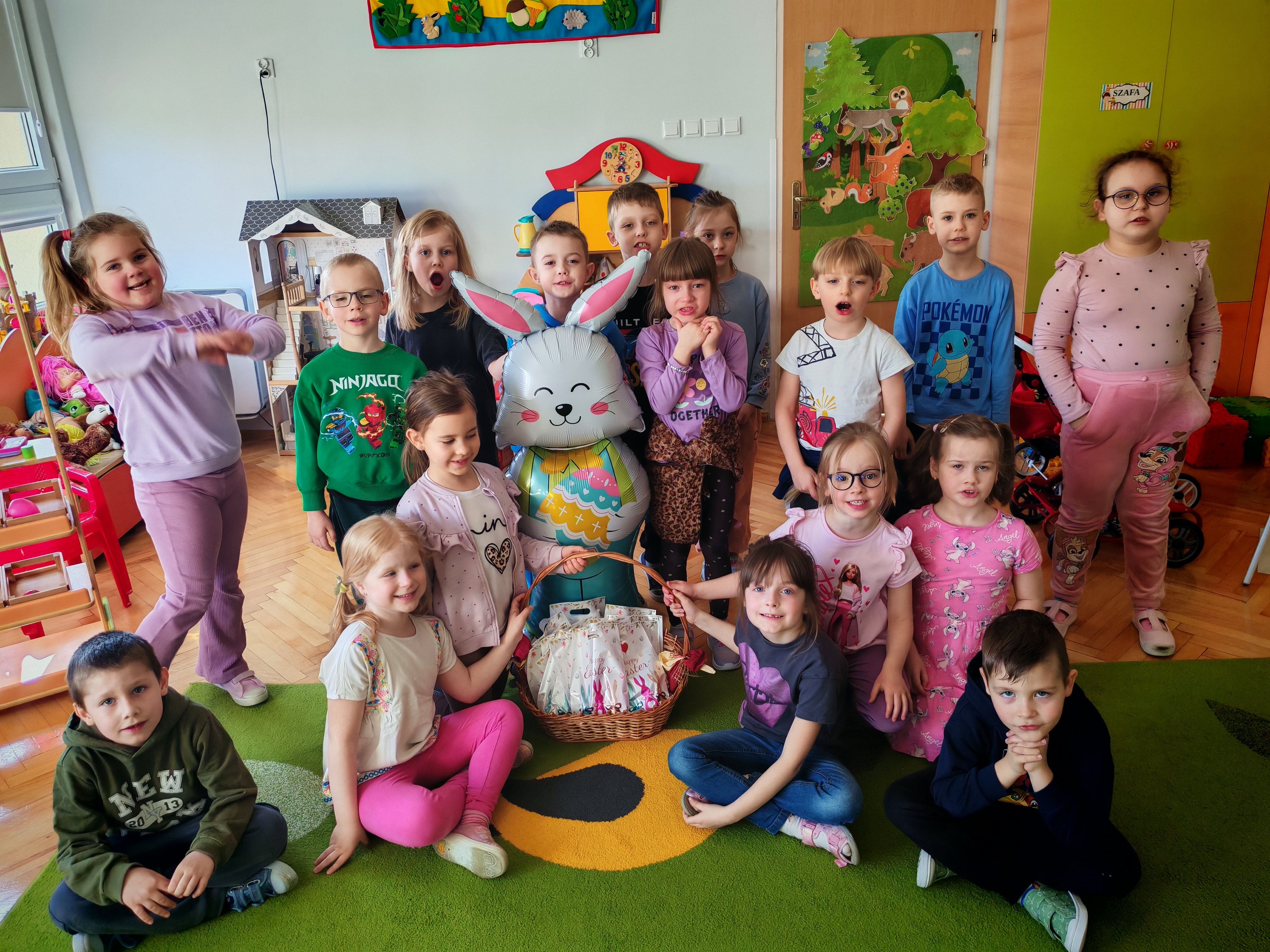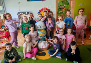 Dziś naszą grupę odwiedził wyjątkowy Gość- Zajączek. Zostawił dla dzieci niespodziankę w postaci ukrytych kopert z zadaniami. Przedszkolaki z wielkim zaangażowaniem wyruszyły na poszukiwania, a następnie wspólnie rozwiązywały przygotowane zagadki,zadania.