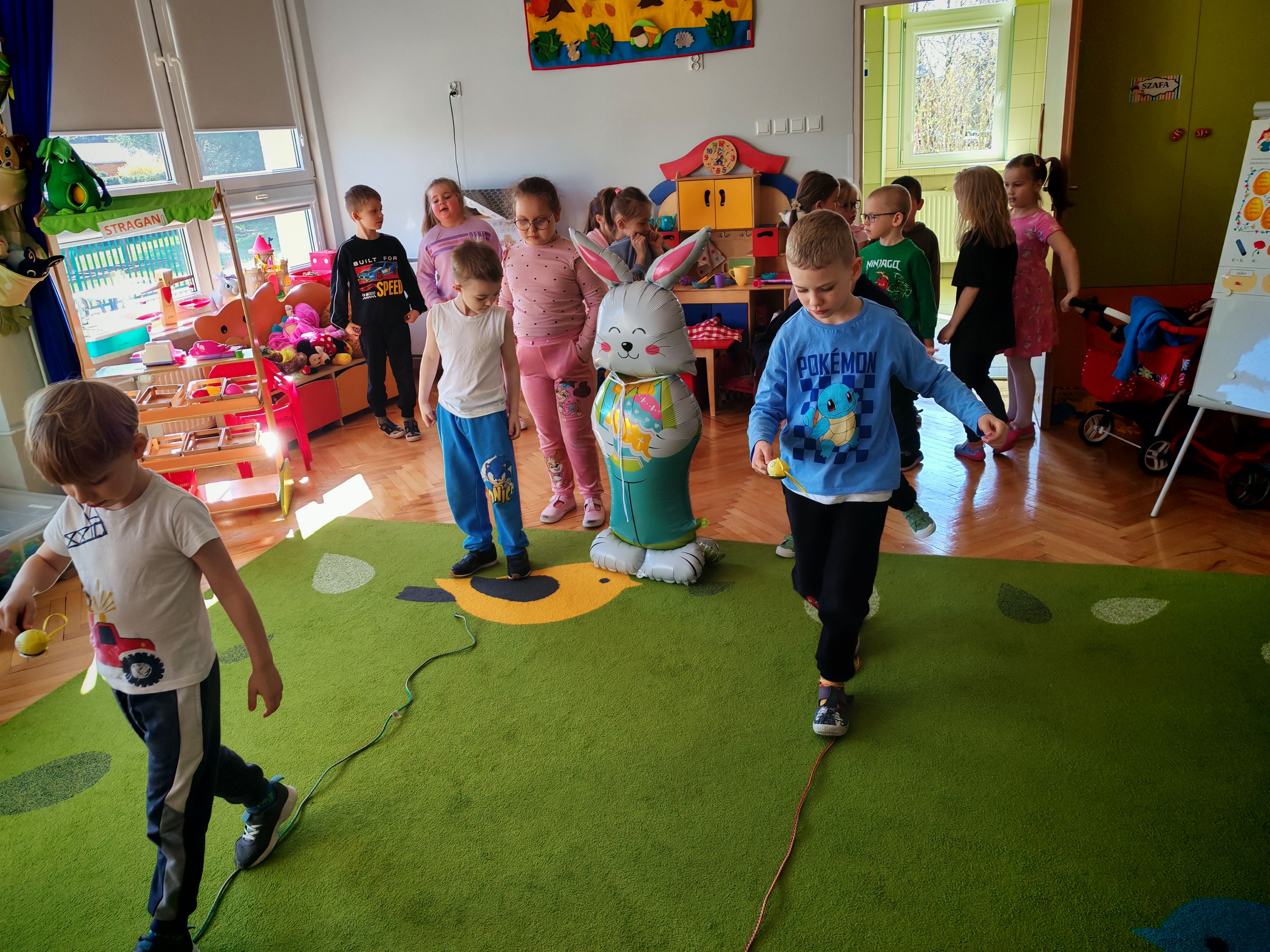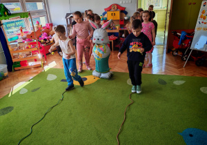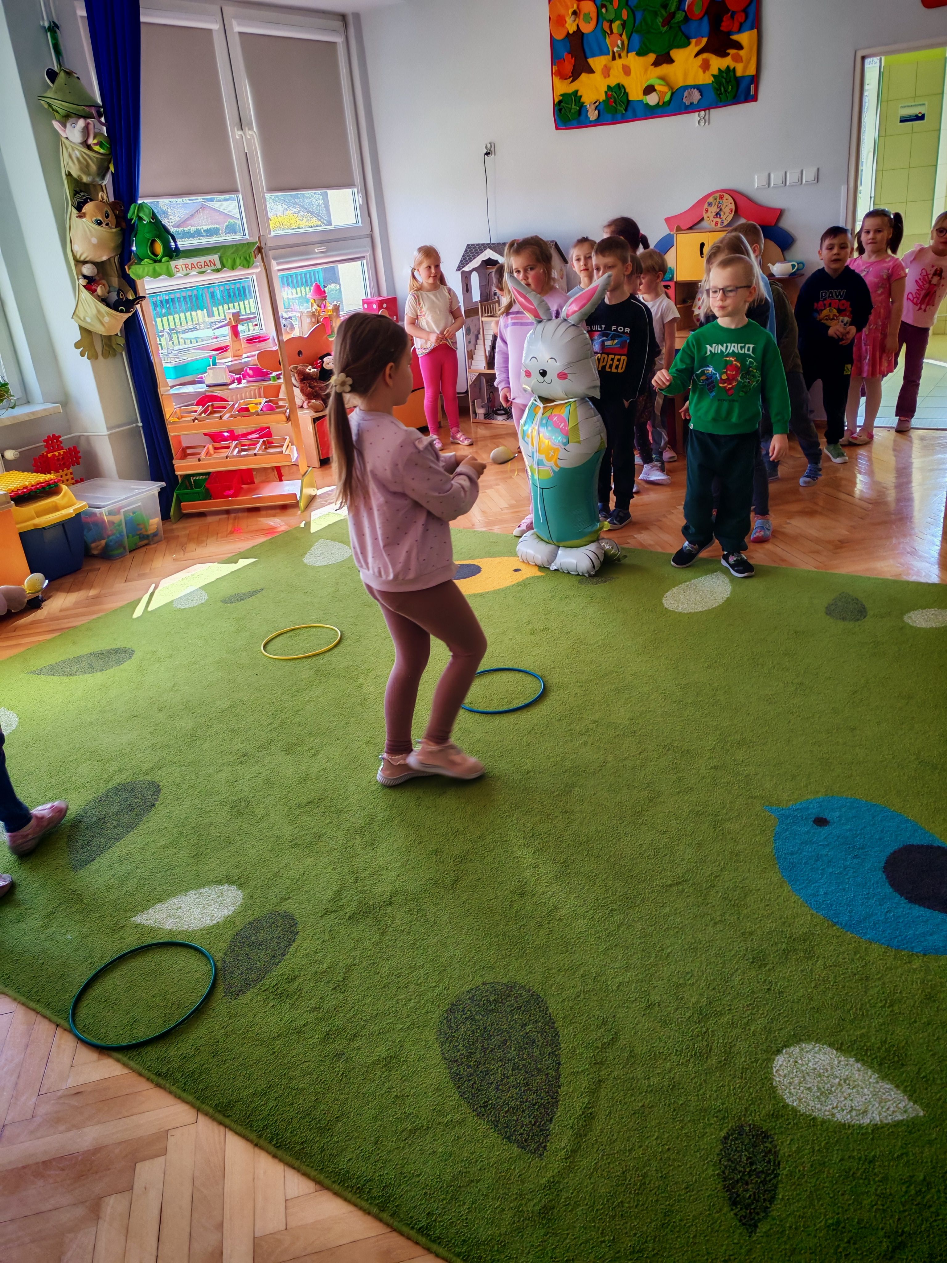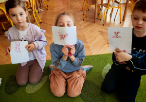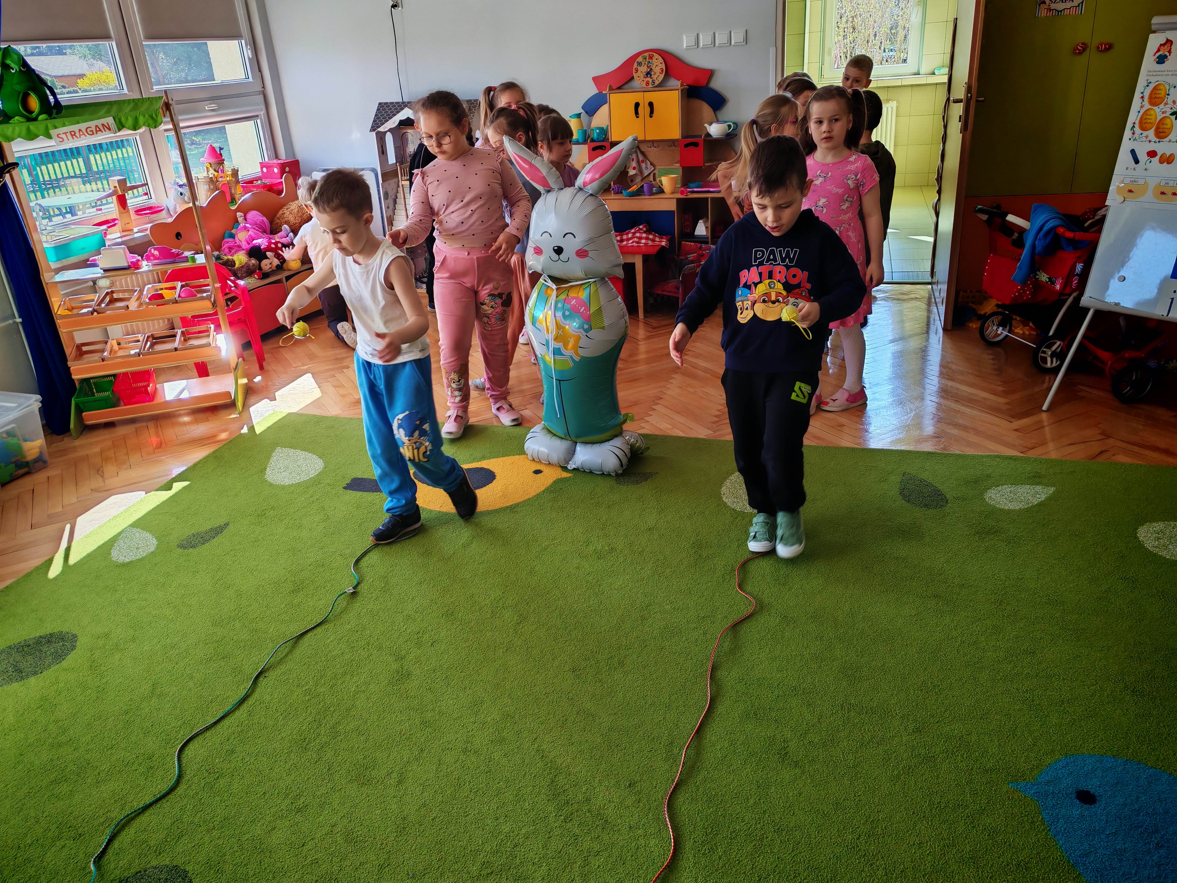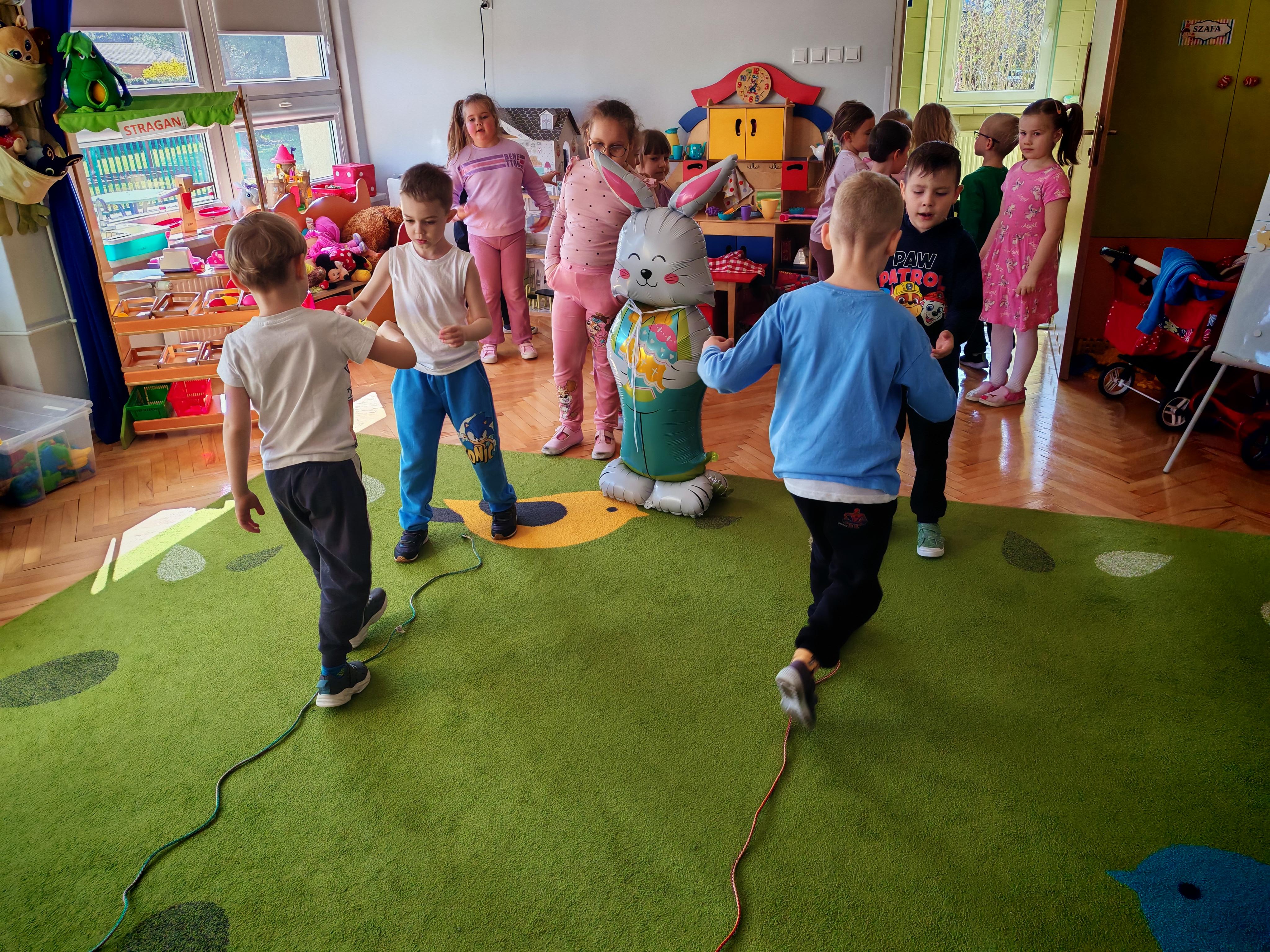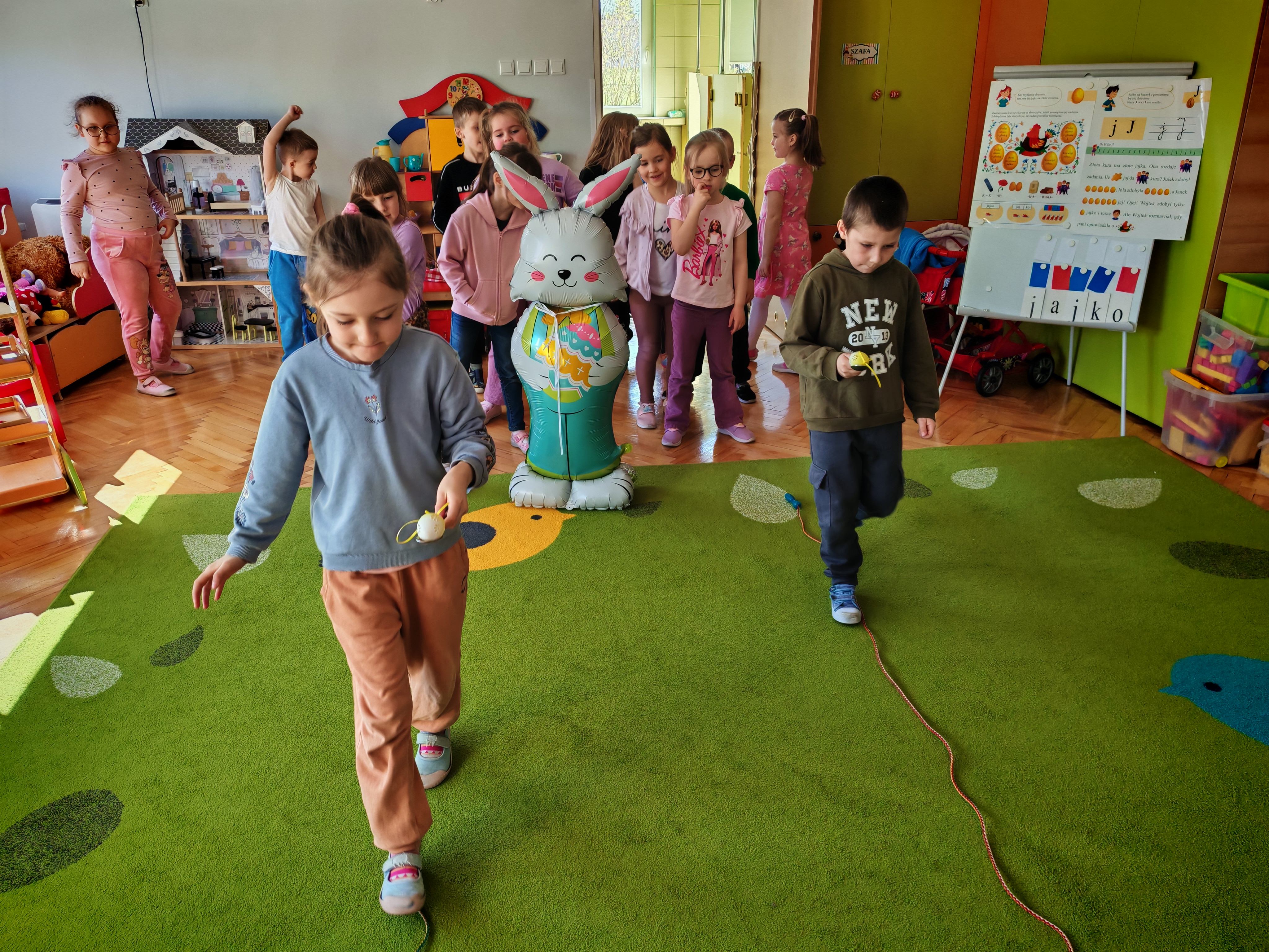 Dziś naszą grupę odwiedził wyjątkowy Gość- Zajączek. Zostawił dla dzieci niespodziankę w postaci ukrytych kopert z zadaniami. Przedszkolaki z wielkim zaangażowaniem wyruszyły na poszukiwania, a następnie wspólnie rozwiązywały przygotowane zagadki,zadania.