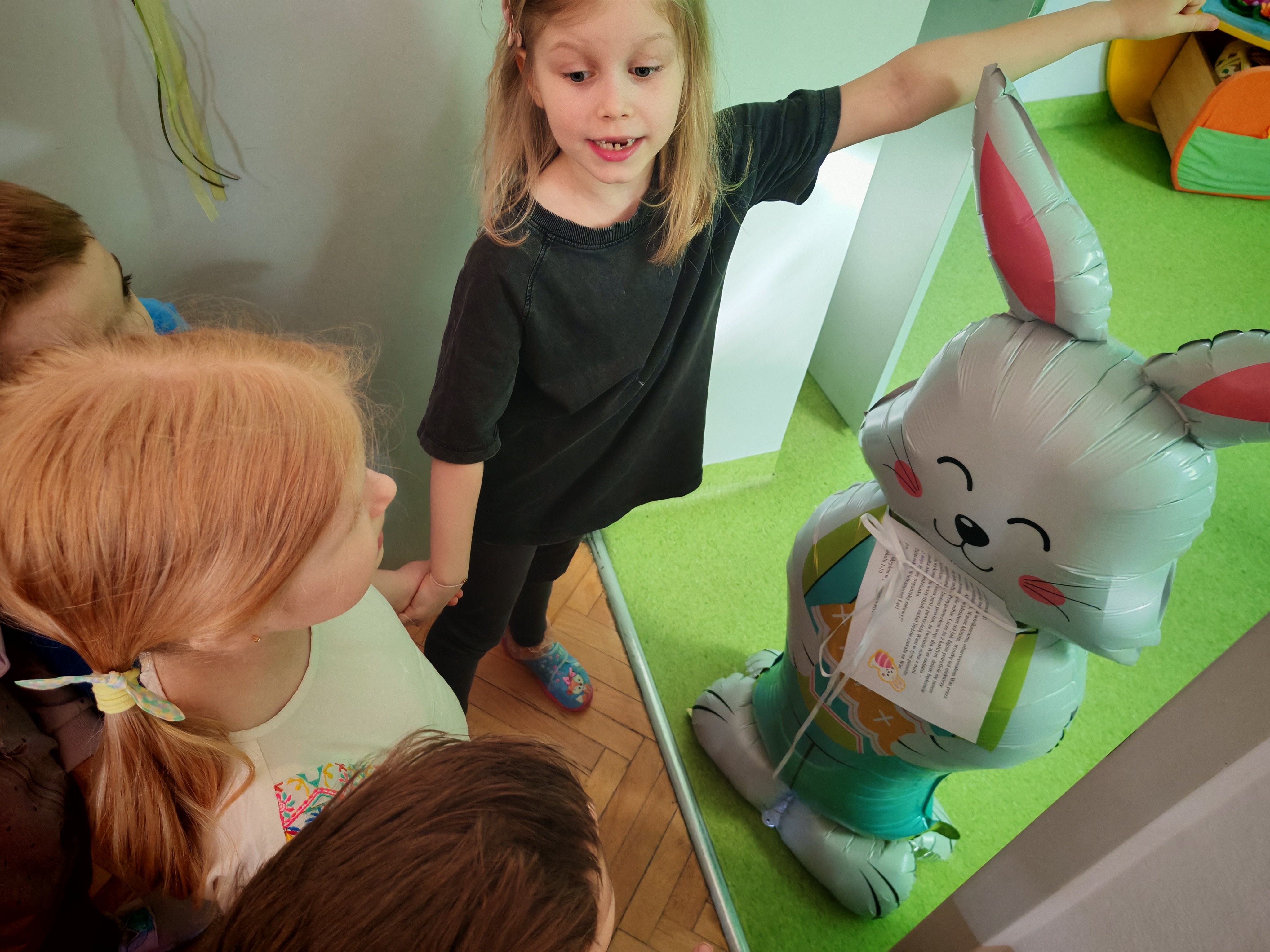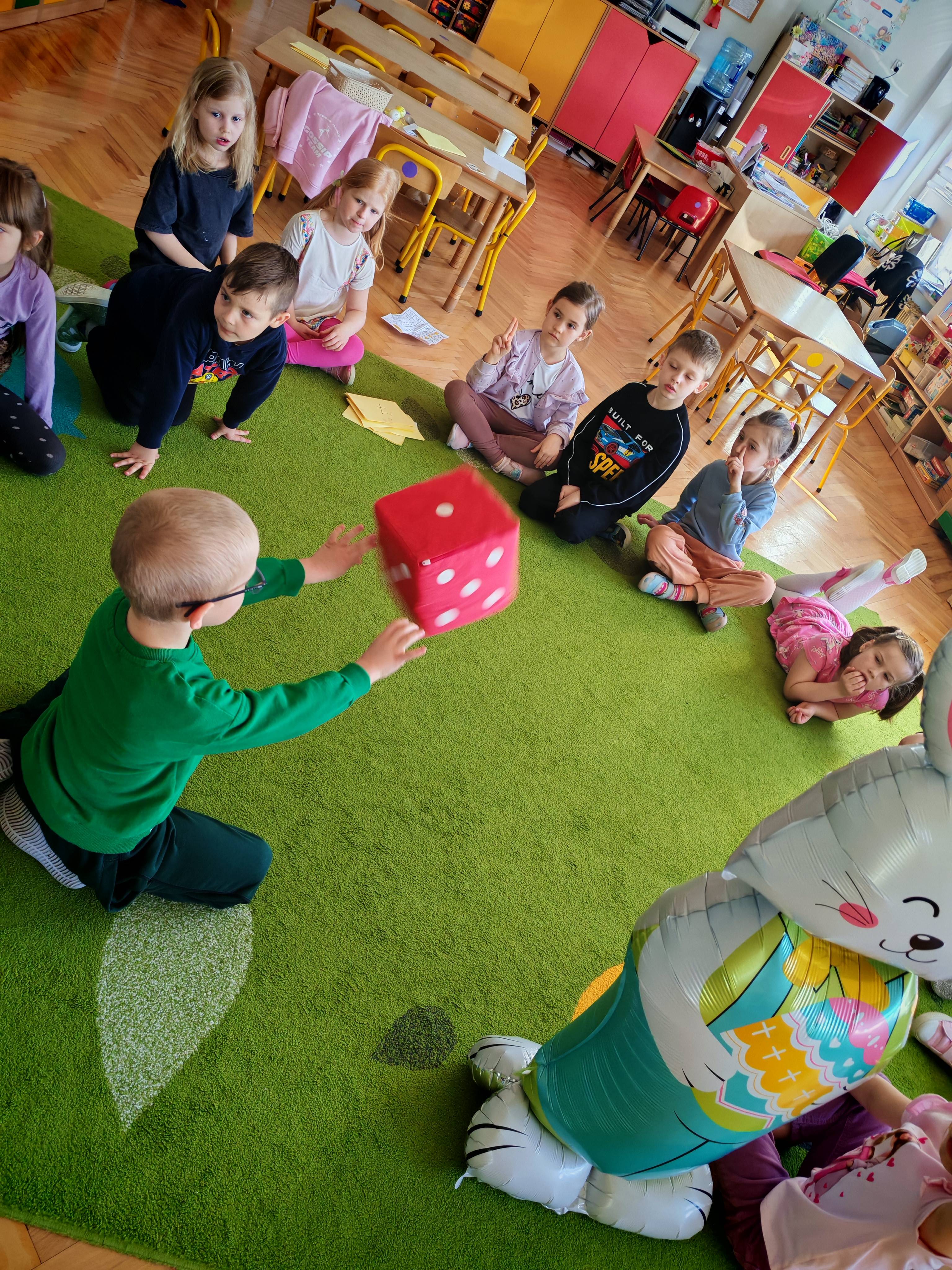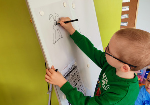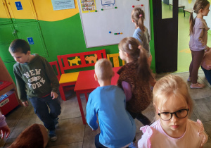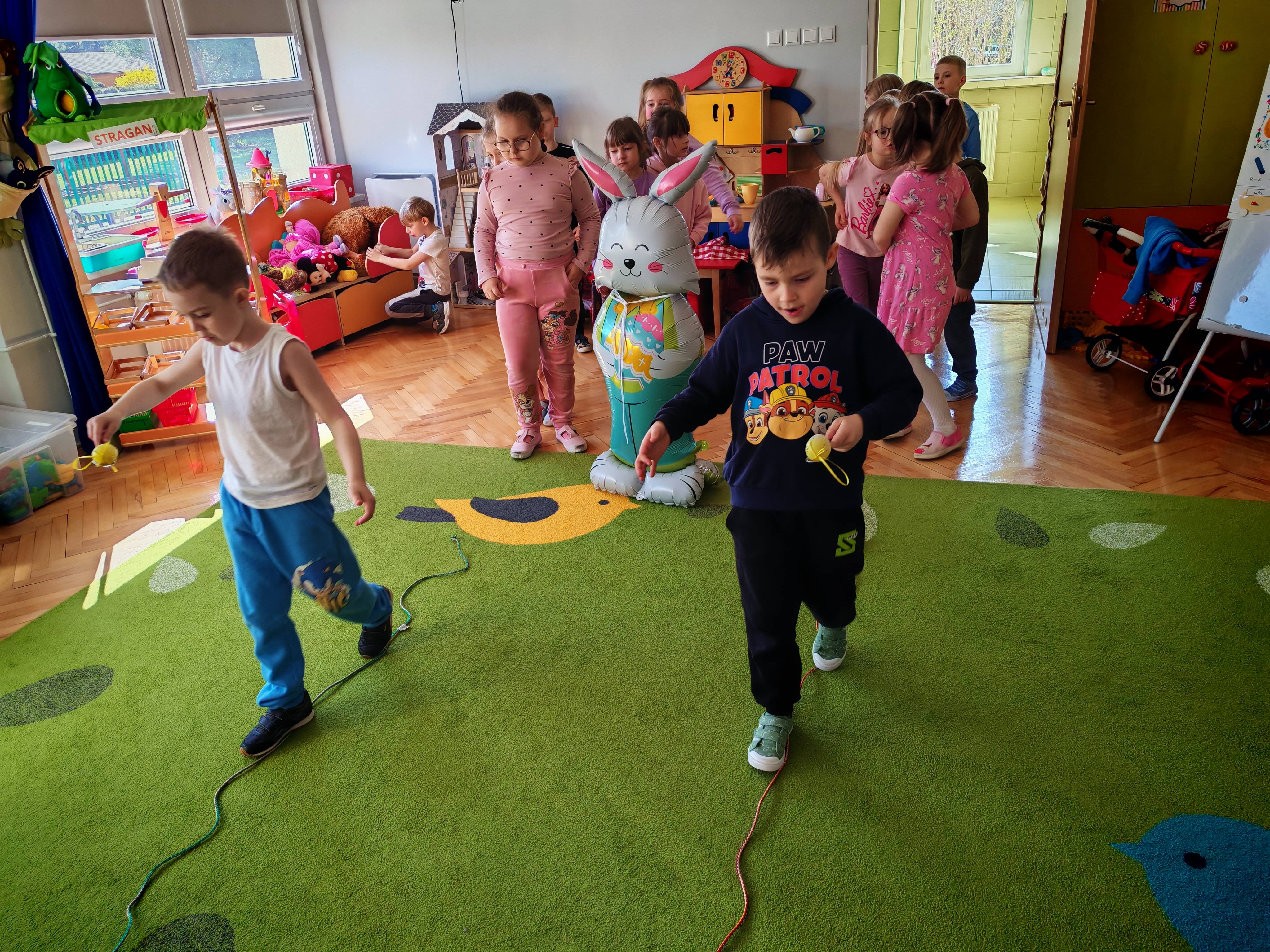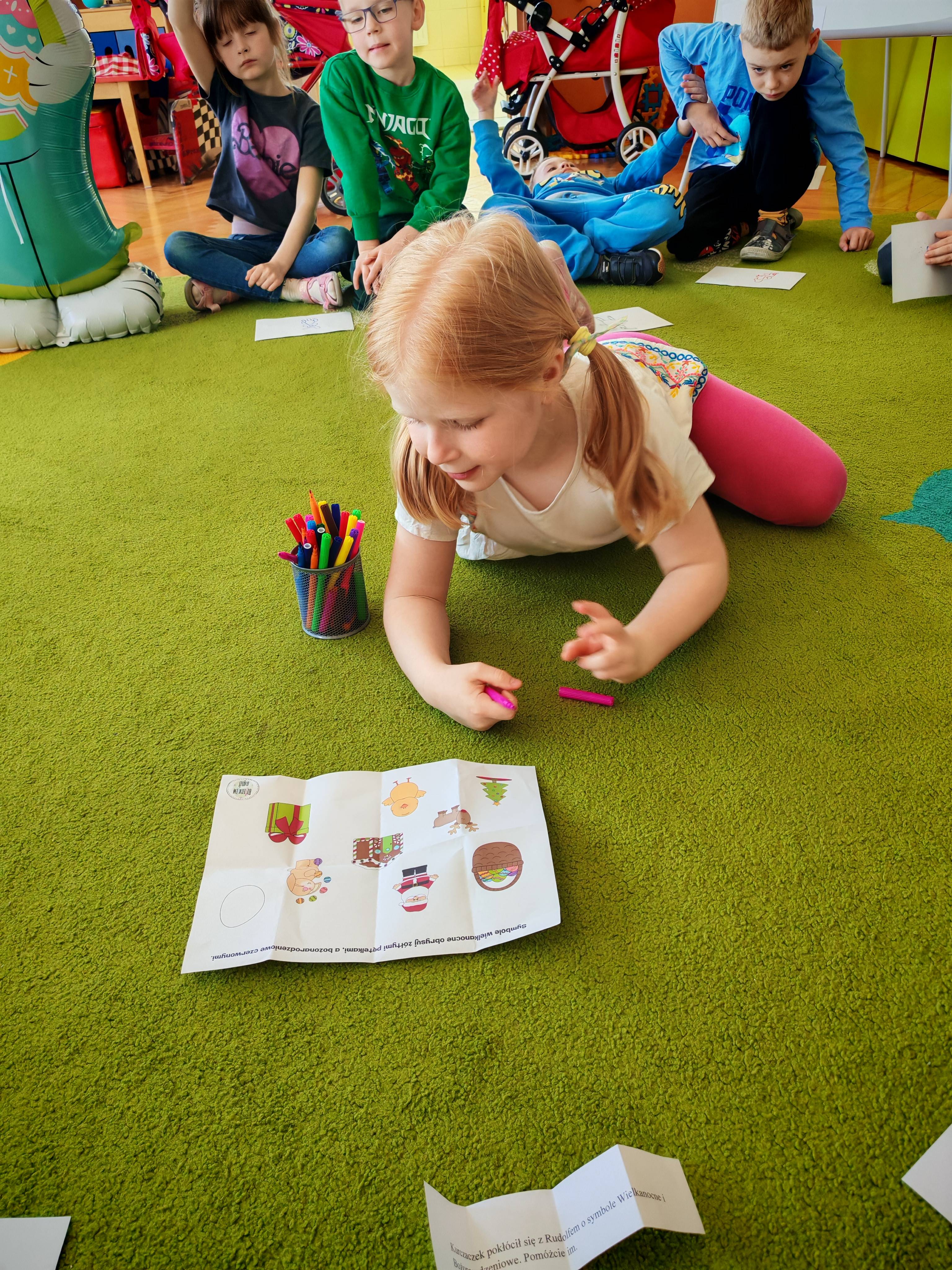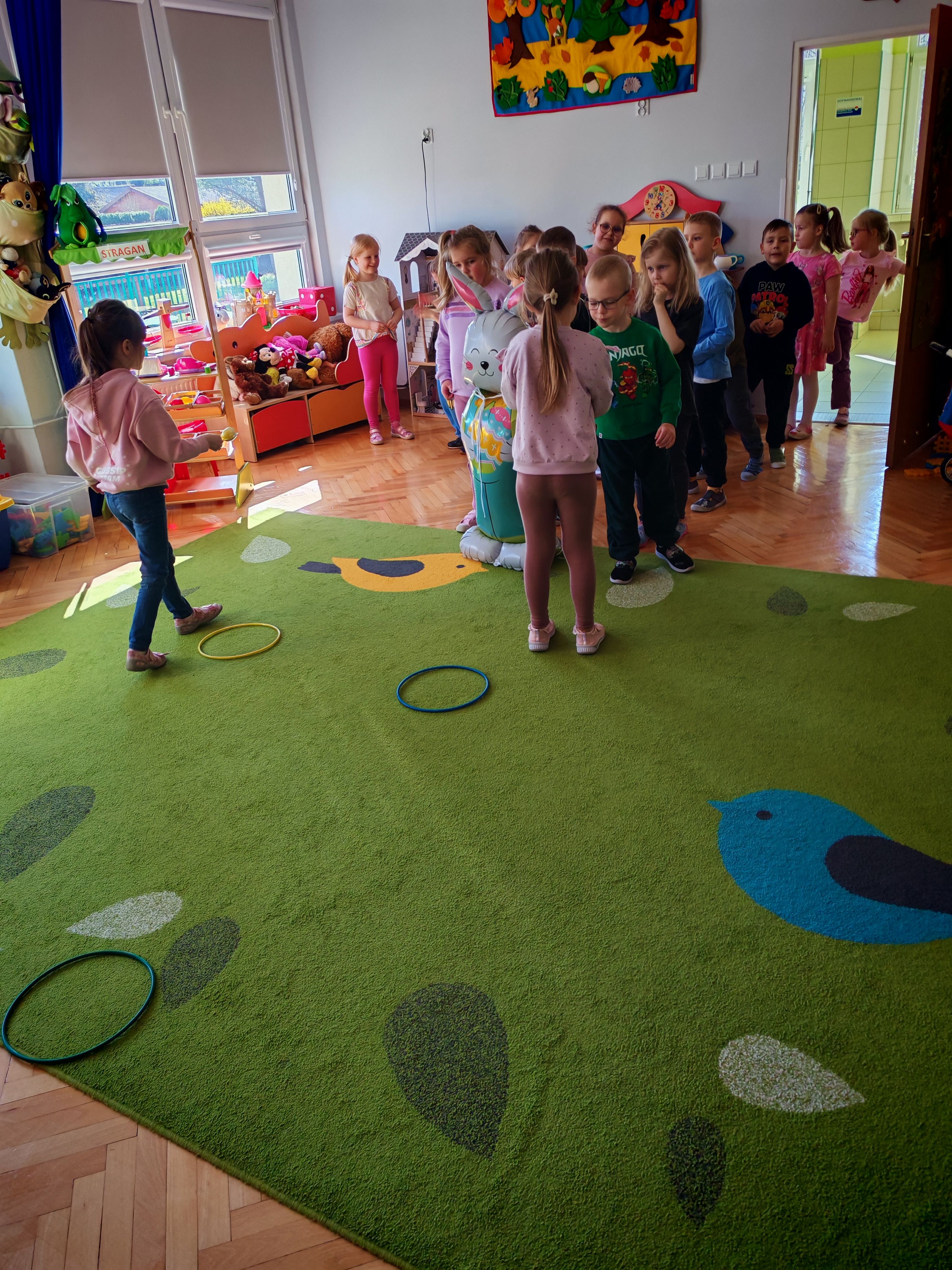 Dziś naszą grupę odwiedził wyjątkowy Gość- Zajączek. Zostawił dla dzieci niespodziankę w postaci ukrytych kopert z zadaniami. Przedszkolaki z wielkim zaangażowaniem wyruszyły na poszukiwania, a następnie wspólnie rozwiązywały przygotowane zagadki,zadania.