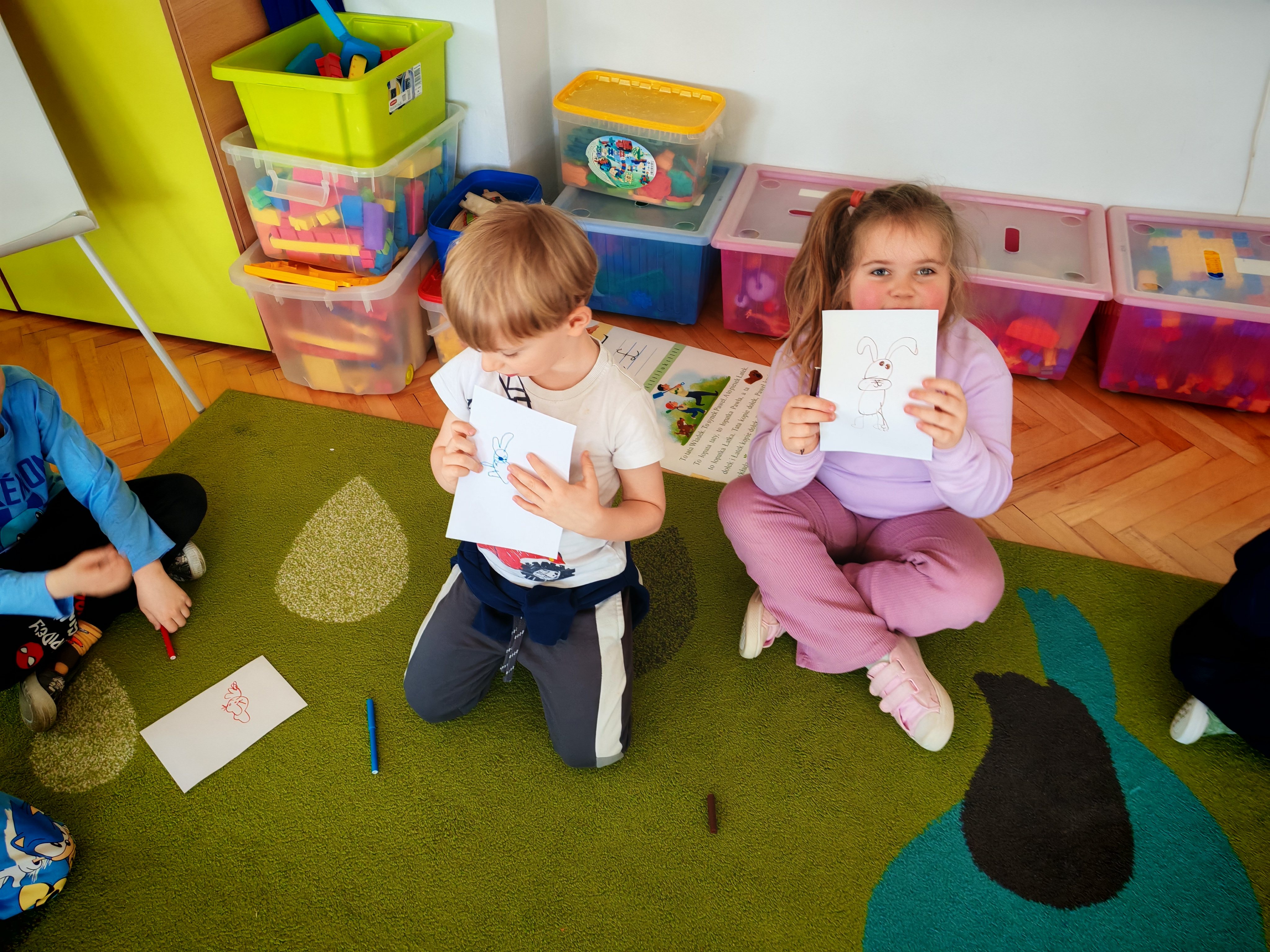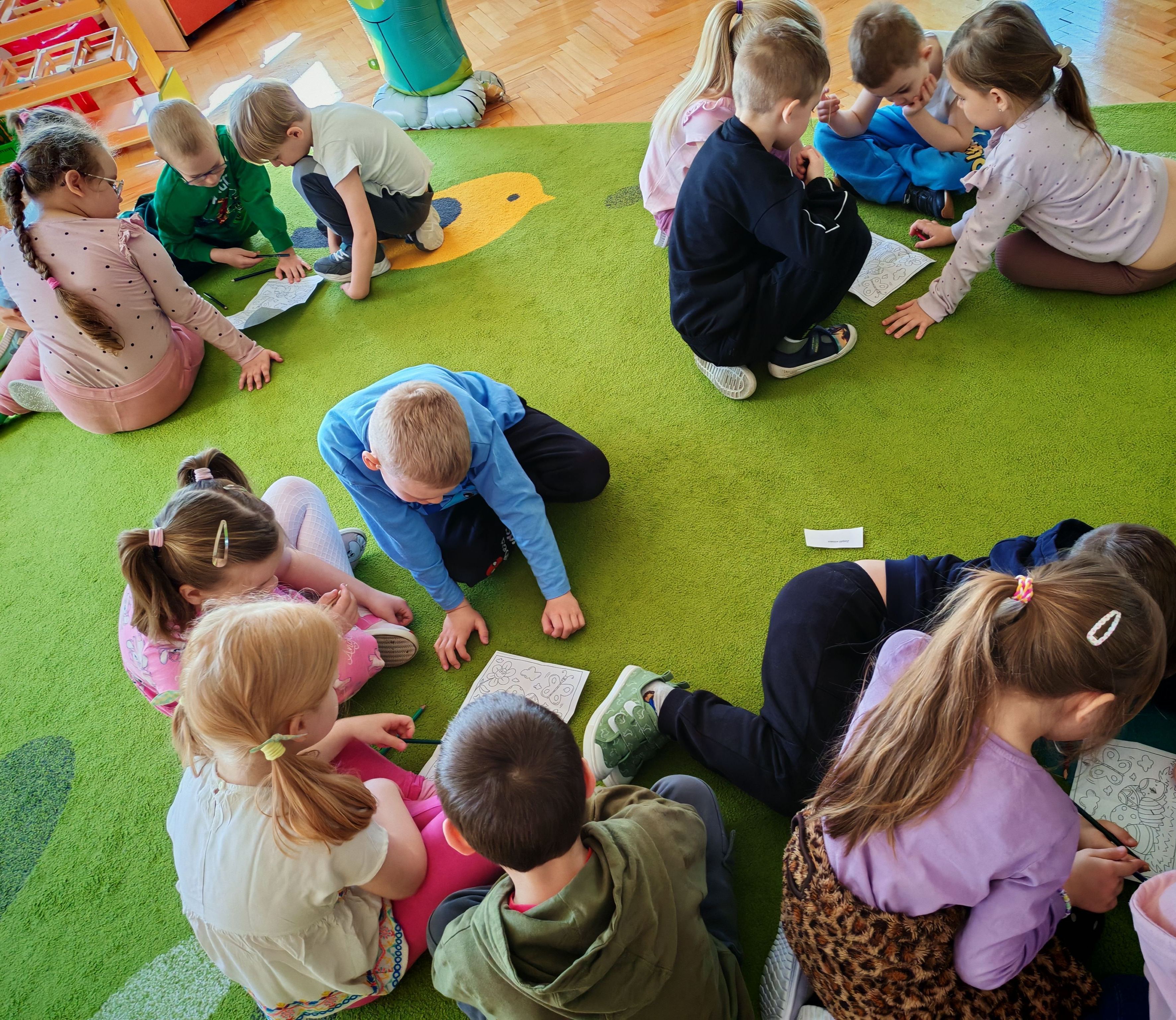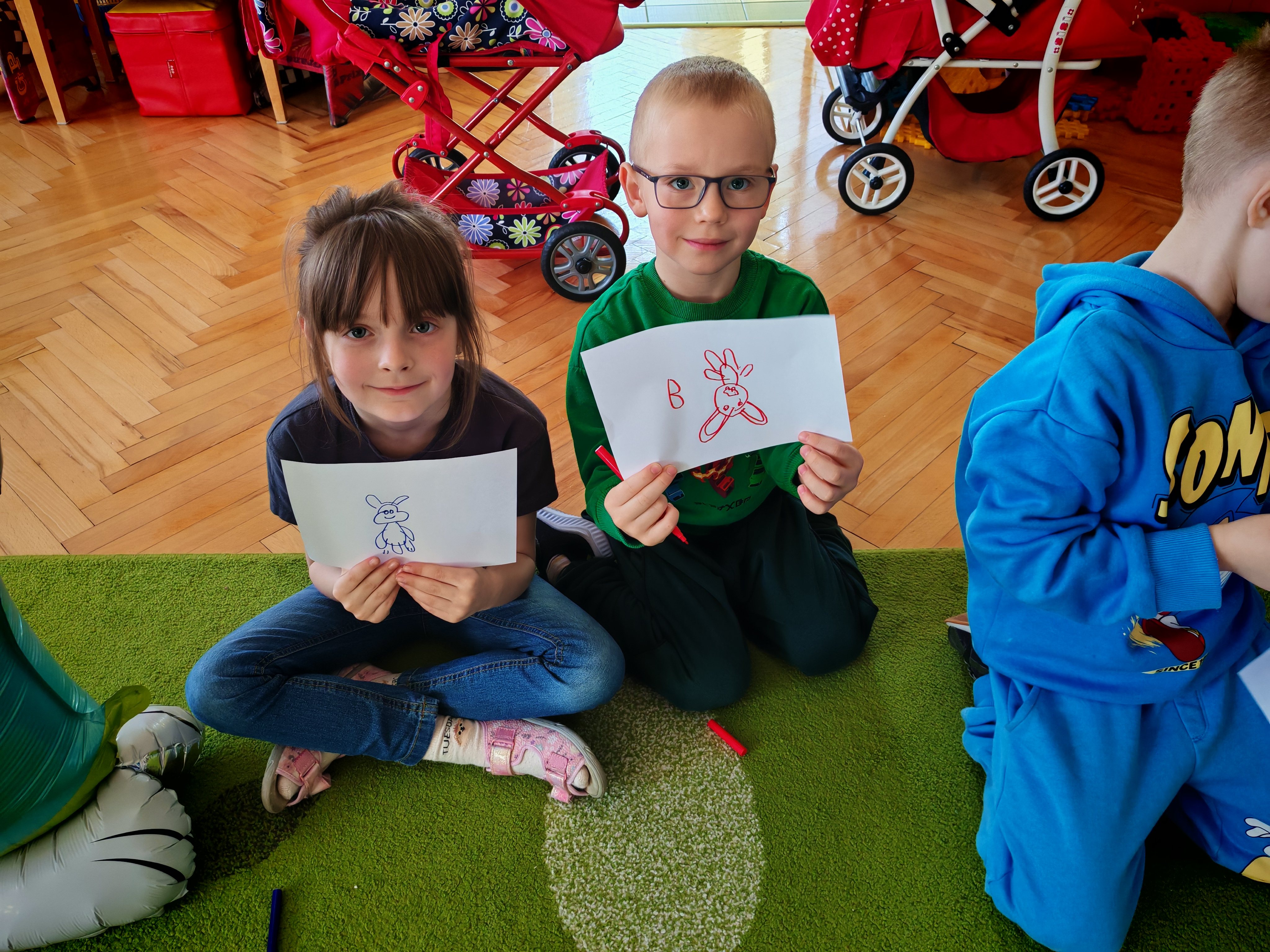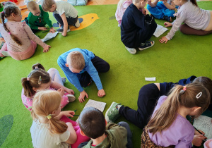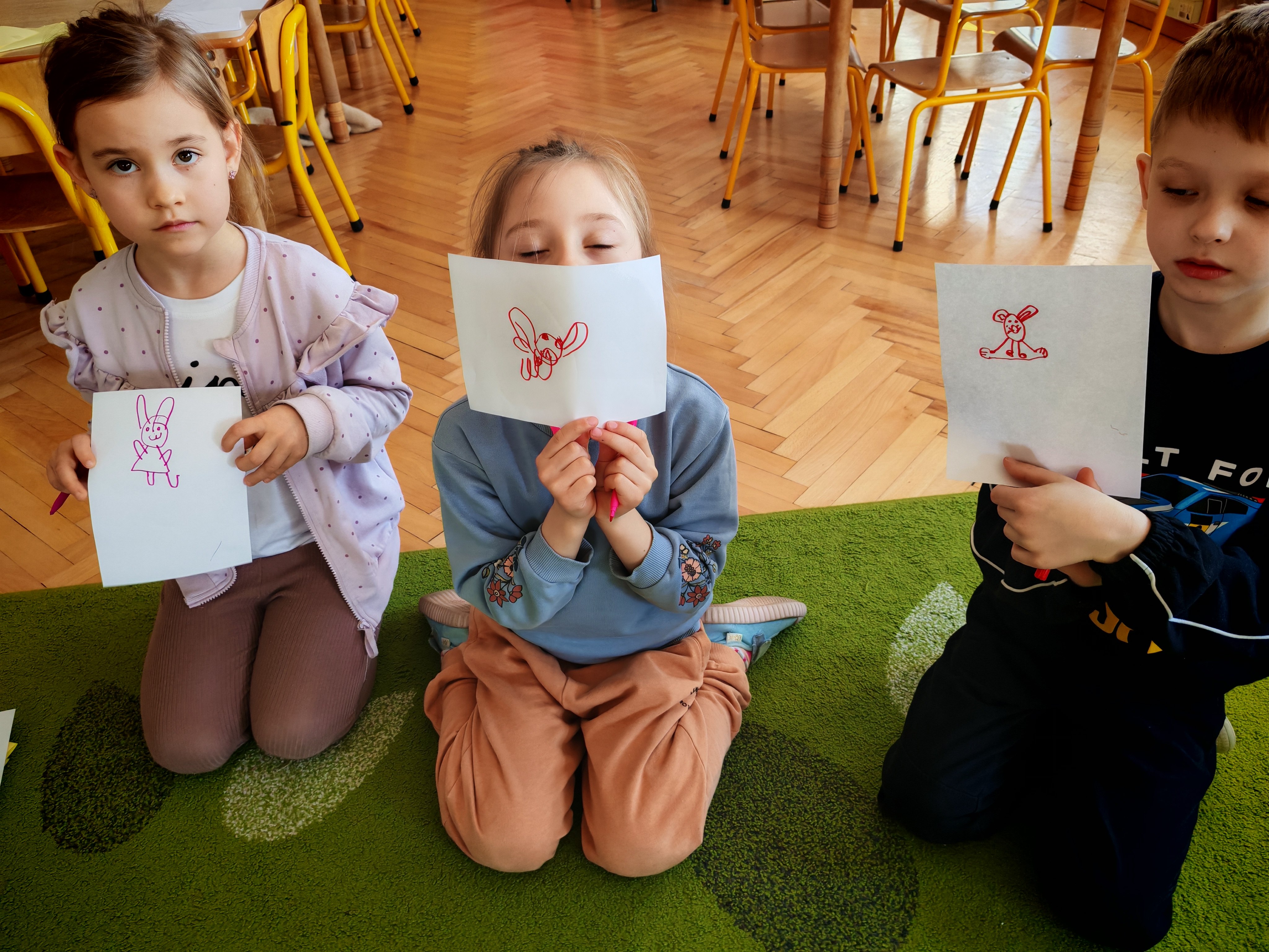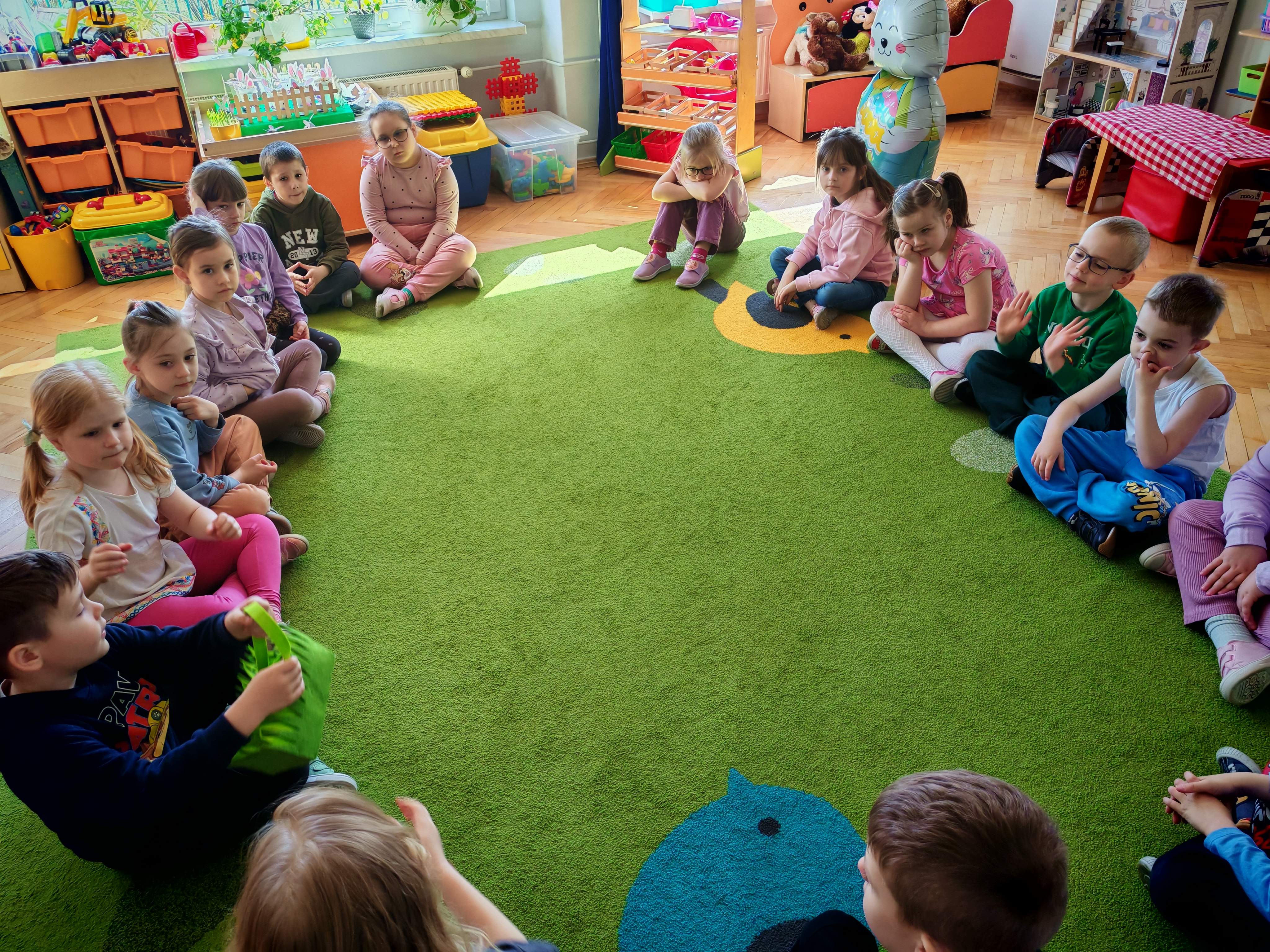 Dziś naszą grupę odwiedził wyjątkowy Gość- Zajączek. Zostawił dla dzieci niespodziankę w postaci ukrytych kopert z zadaniami. Przedszkolaki z wielkim zaangażowaniem wyruszyły na poszukiwania, a następnie wspólnie rozwiązywały przygotowane zagadki,zadania.